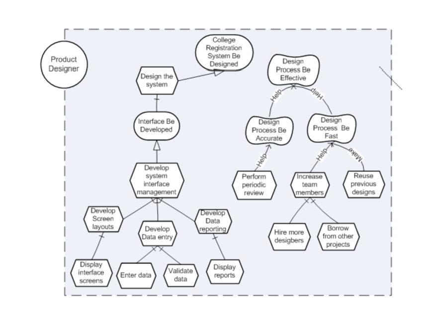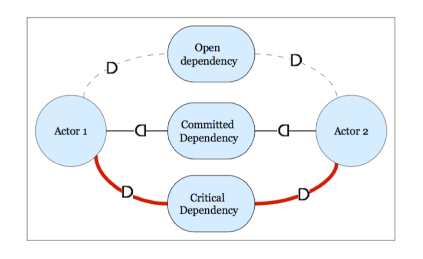In fact, the main idea of i* involves, actors who depend on each other for goals to be achieved, for resources to be provided, for tasks to be performed, and for softgoals to be satisfied related to version 1.0 of notation [6] and qualities to 2.0 version [2]. The SD model shows the organizational context of the system as a network of dependency relationships among actors. This network contains a set of nodes and links where each node represents an actor and each link map out one dependency between two actors. Therefore, a dependency is a relationship where one actor (the depender) depends on another actor (the dependee) to achieve a goal, to perform a task, to provide a resource or to achieve a softgoal; reflecting distinct types of freedom can be achieved by relationship. Another model is the SR which shows the representation of the “internal rationale”. Specifically, the relationships behind the actors. Thus, it offers more details with the representation of the intentional relationships that are internal to the actors.