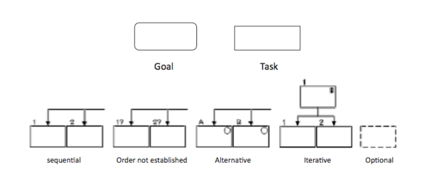 Briefly, to assist designers in task analysis both i* and GOMS cover moderately this approach. But, to further illustrate the lack of adequate task analysis, consider the i* diagram in Fig. 3, although the tasks are clearly shown, it is not possible to identify the option more adequately that user should choose, or if all tasks should be execute, or if some tasks should be omitted or simply what sequence they (tasks) should follow in order to satisfactorily be executed and how to finish this execution.