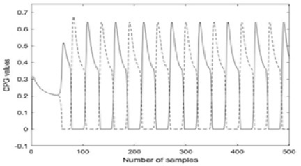 Interest in the use of central pattern generators (CPGs) has been due to its ability to emulate the behavior of the neural ensemble which allows the execution of rhythmic displacements without the use of feedback [8]. Multiple problems have been addressed, as can be seen in the work of [10] where an algorithm based on PPOC policies is employed to generate the input patterns in a CPG network that are subsequently used in the navigation of a snake-based robot. On the other hand, the work of [22] employs Matsuoka’s algorithm to emulate the adaptability of walking in humanoid type robots. Other illustrations include the work of [12] where Matsuoka’s algorithm is used in robot walking, the generation of chewing rhythms [25] or the control of traffic signals [6].