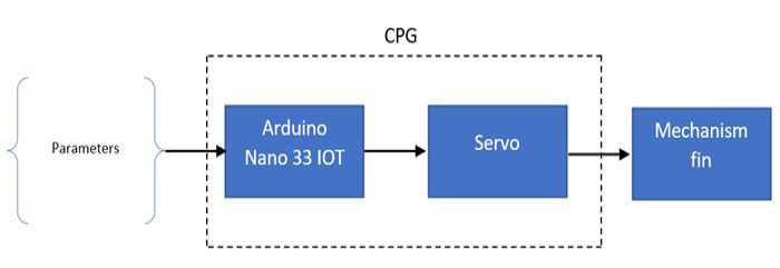 For CPG implementation, the robot fish to be used will first be described, together with the range and its characteristics. The responses of the end effector to the signal sent will then be analyzed. The control structure used can be visualized in Figure 4, showing the control loop of the system.