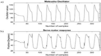 In Figure 9, graph a) corresponds to the pulse train that was sent from the controller to the servomotor, followed by the behavior of the servomotor that can be visualized in graph b). It is worth mentioning that the behavior is much closer to the dynamics proposed by Matsuoka.