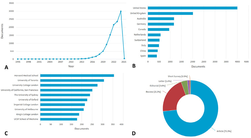 The global evidence on digital health yielded 11,182 results. A notable increase in publications has been observed since 2016, with sustained growth to date (Figure 1A). The United States and the United Kingdom lead scientific production in this area (Figure 1B), with prominent contributions from institutions such as Harvard Medical School and the University of Toronto (Figure 1C). As shown, the majority of publications consist of research articles (Figure 1D), highlighting the originality in developing experimental ideas, likely attributed to the multidisciplinary nature inherent to digital health.