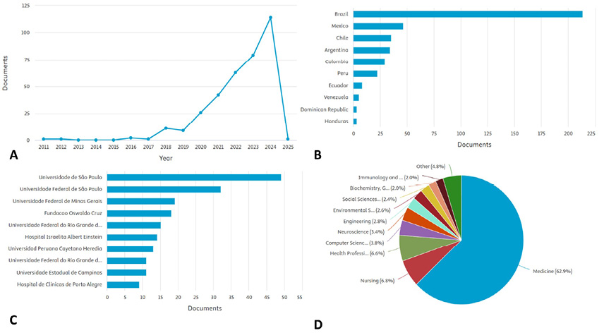 Filtering by Latin American countries revealed that the region accounted for only 3.13% (n=350) of the total scientific production, with marked and sustained growth observed starting in 2019 (Figure 2A), a few years behind the global trend. Brazil emerged as the leading country in the region, followed by Mexico and Chile (Figure 2B). Among the top 10 most active institutions in this field within Latin America, nine are located in Brazil, underscoring its regional dominance (Figure 2C). Regarding the disciplines contributing to this evidence, the majority of research has been conducted in Medicine (62.9%), followed by Nursing (6.8%) (Figure 2D).