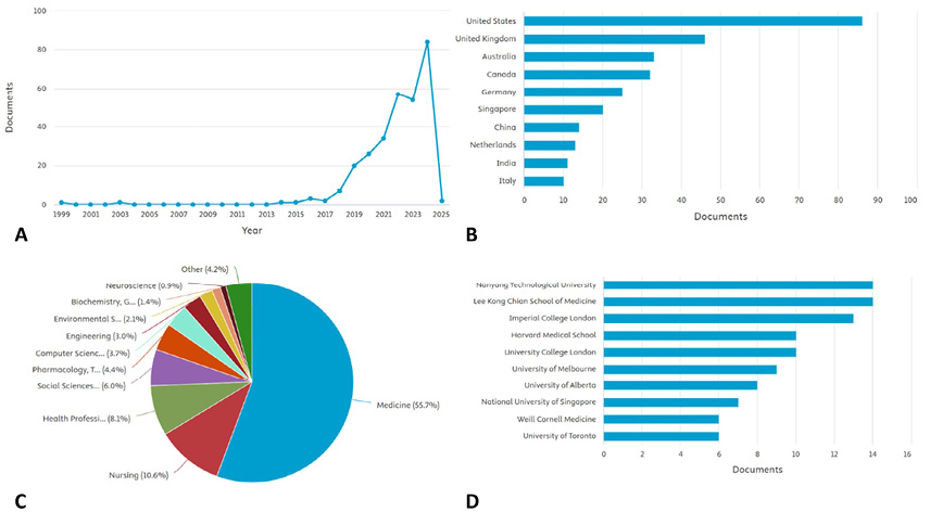 When examining evidence on digital health specifically linked to the professional education of healthcare providers, a markedly different scenario emerges. Globally, only 293 scientific documents have been published, with notable progress beginning in 2018 (Figure 3A). This area is again led by the United States and the United Kingdom (Figure 3B). Medicine and nursing represent the most frequently explored fields (Figure 3C). In this context, the leading institutions are more diverse, including organizations from Asia, Europe, and North America (Figure 3D).