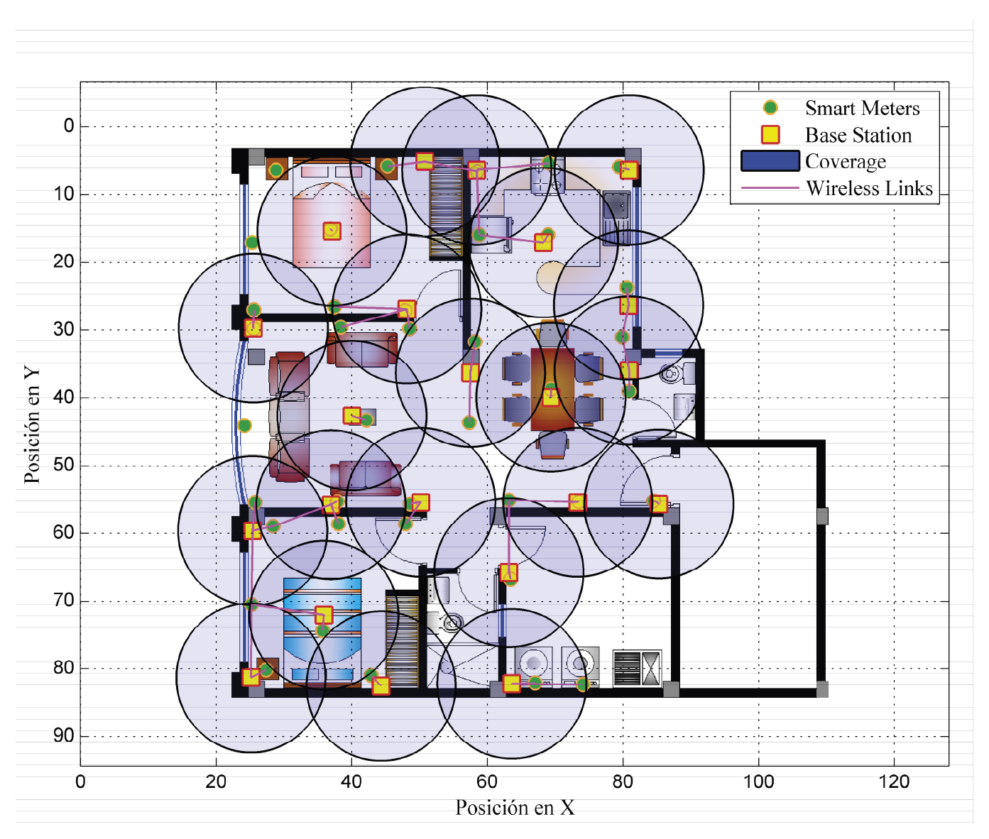 Mediante la utilización de un algoritmo matemático desarrollado en matlab se puede lograr optimizar las redes de sensores inalámbricos, con lo cual podremos disminuir considerablemente los puntos de acceso, que nos permitan una máxima cobertura de los sensores. Teniendo en cuenta que estas redes de sensores principalmente se basan en la norma 802.15.4, cabe señalar que los servicios de movilidad son manejados por capas superiores que no se encuentran dentro de estas normas [43]. Las potencias de pico de la red eléctrica son atribuidas generalmente a las cargas flexibles, es decir, a dispositivos flexibles, los cuales pueden ser controlados [11]. Estos son sistemas de redes inteligentes en los que se implantarán también medidores inteligentes o actuadores, que permitirán gestionar de mejor manera la energía suministrada, y tomar acciones directas sobre las áreas residenciales o sobre cada uno de los equipos electrónicos y eléctricos de una vivienda. Incluso se puede llegar a la sincronización de las formas de onda, que generalmente son de impulso, de los dispositivos o equipos para obtener redes inteligentes auto adaptables [11].