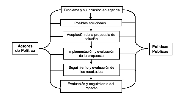 Esta figura distingue el inicio del proceso planteando la problemática y agendando, luego, la oferta de solución a los problemas, aceptación de propuestas, implementación, seguimiento y evaluación. También evidencia procesos de identidad colectiva, al considerar una estrecha interrelación entre actores sociales y políticos en cada una de sus fases; ello se refiere a lo ya defendido por los investigadores de que las acciones enfrentadas por los gobiernos no solo dependen de las decisiones por parte de los funcionarios públicos, sino también del colectivo y de los resultados de las interacciones entre éstos y los intereses afectados.