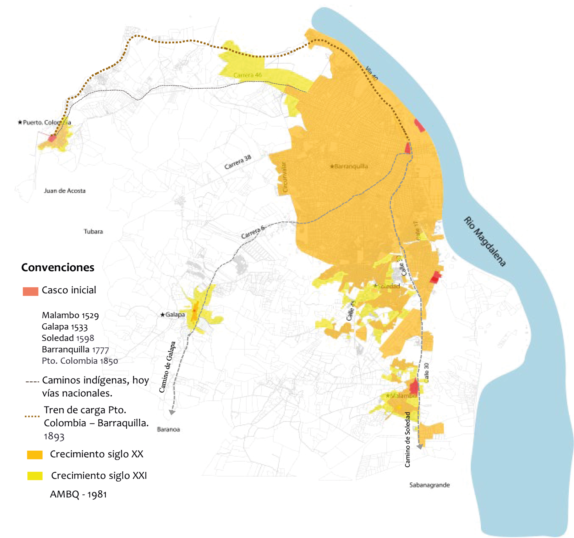 Figuta 1. Mapa histórico sobre crecimiento y transporte en el AMBQ.