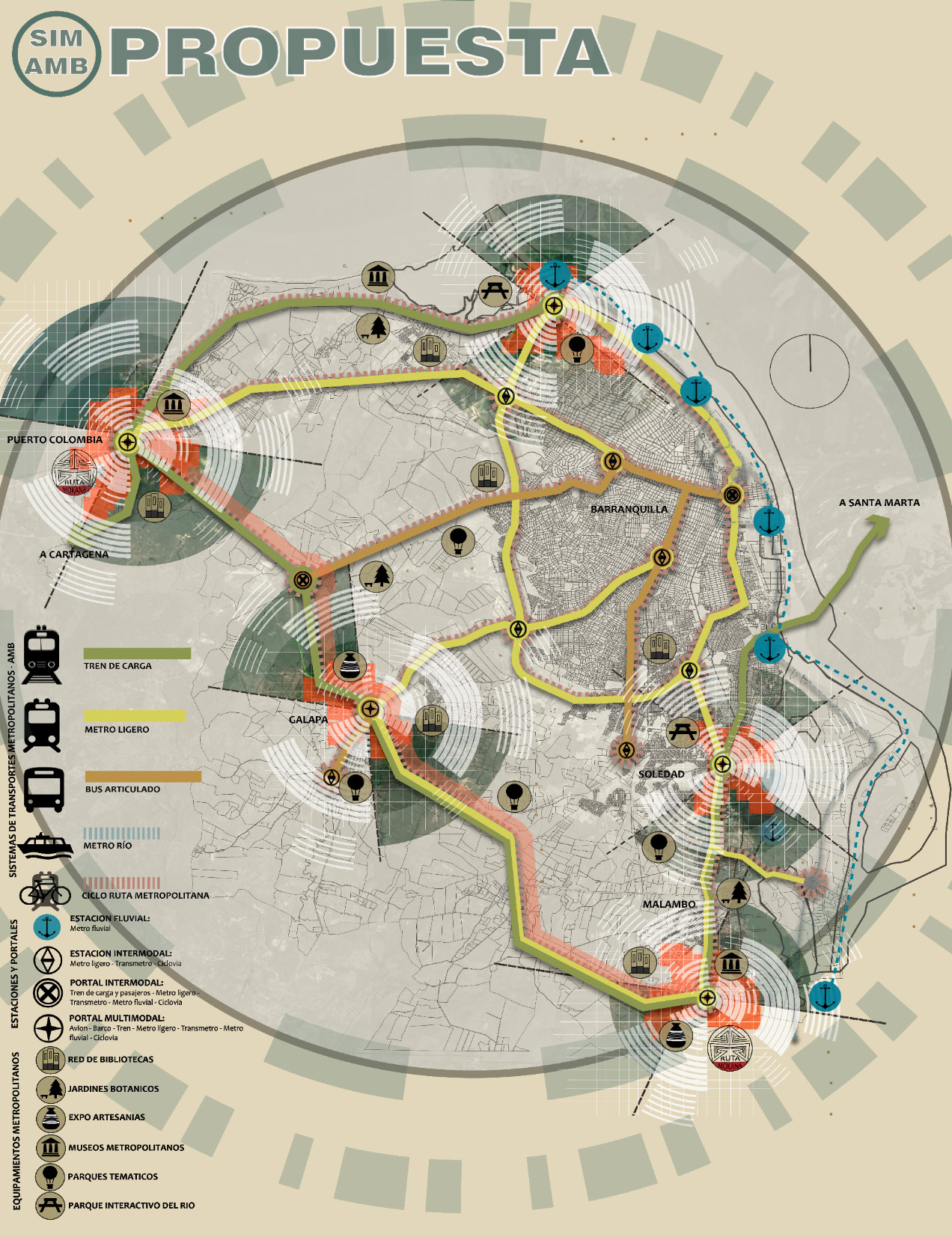 El AMBQ ha venido trabajando desde 2005 para instalar un sistema tronco-alimentado de transporte (Transmetro), basándose en la experiencia del Transmilenio de Bogotá. Con la intención de reordenar la trama vial, los flujos vehiculares, los medios de desplazamientos y los tiempos de recorrido del AMBQ; pero, dicho sistema solo abastece el 13% del territorio metropolitano, conectando solo al municipio de Soledad con el distrito de Barranquilla. Por ello en esta investigacion se propone que través del Sistema Integrado de Movilidad para el Área Metropolitana de Barranquilla por sus siglas SIM-AMBQ una nueva red de nodos de actividades humanas a escala metropolitana que fomenta el poli-centrismo del territorio, articulándose a un conjunto de equipamientos como elementos arquitectónicos y elementos naturales que fortalecen el rango de influencia de cada nodo. Cabe resaltar que la propuesta está fuertemente ligada a la sostenibilidad pues los medios de transporte propuestos poseen características amigables, ya que, promueven la aplicación de nuevas tecnologías, la utilización del espacio público y el aumento de zonas verdes, respetando los sistemas estructurantes naturales del territorio y fortaleciendo la participación ciudadana con el medio ambiente.