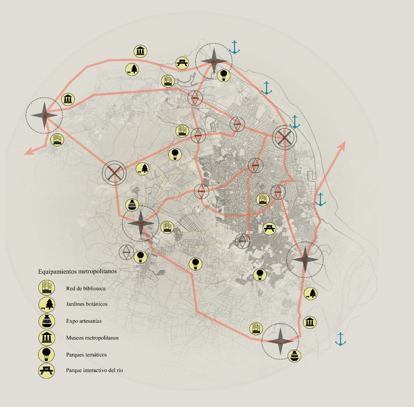 Nueva red de nodos: puntos estratégicos que complementan los equipamientos propuestos y/o existentes que revitalizan los ejes ambientales, hitos, centros históricos y turísticos, para fortalecer la conectividad e integrar todos los sistemas de transporte a todas las escalas.