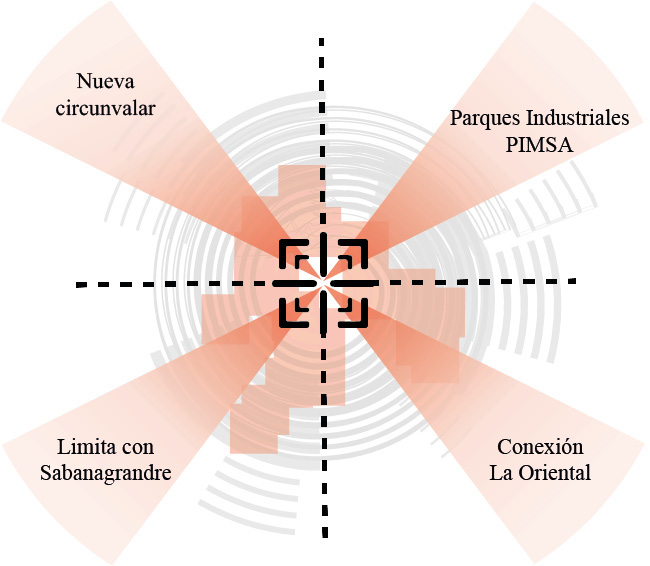 Debe ser un proyecto integrado a la red urbana metropolitana y el predio donde se desarrolle el equipamiento debe estar ubicado estratégicamente, de forma que, conecte ejes viales importantes, nodos educativos, parques industriales, zonas rurales y elementos naturales estructurantes. La función más importante es la de interconectar los diferentes medios de transporte que se integran en él, como el tren de carga y pasajeros, metro ligero, Transmetro y buses intermunicipales, además de medios particulares. Ofreciendo así diferentes escalas de conexión.