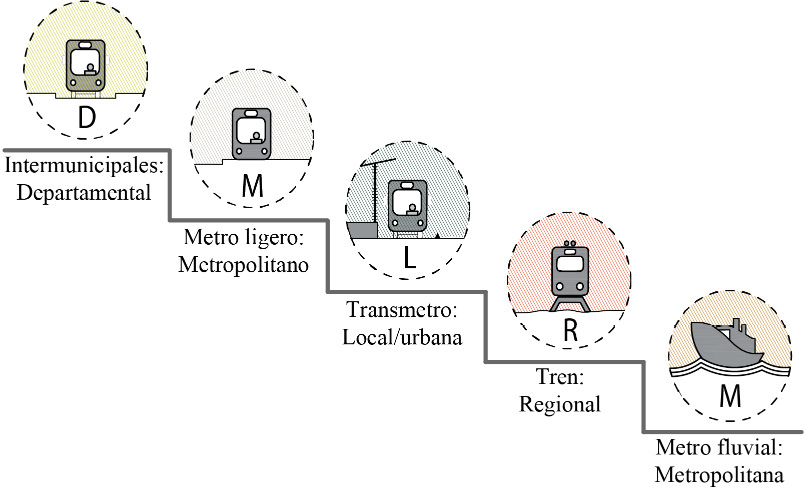 En el caso del AMBQ el sistema integrado de movilidad y transporte se estructura alrededor del Metro Ligero, siendo este el que bordea el municipio núcleo formando un anillo vial y de él se desprenden cadenas de transporte sobre las vías metropolitanas (a excepción de la Murillo), con el fin de distribuir dentro y fuera la población que ingresa en las horas punta de la mañana y de la tarde; por lo tanto, el Transmetro y sus rutas alimentadoras, las rutas reorganizadas del transporte público colectivo TPC, el sistema público de bicicletas, el tren regional del carga y pasajeros y el Metro fluvial, componen los medios que alimenta al metro ligero. Pero cada nodo (portal y/o estación) tendrá un sistema predominante que no necesariamente será el metro ligero, esto depende de cómo se dan los desplazamientos y la movilidad y también, las características de cada nodo y su relación con el sistema metropolitano (Rodríguez, n.d.).