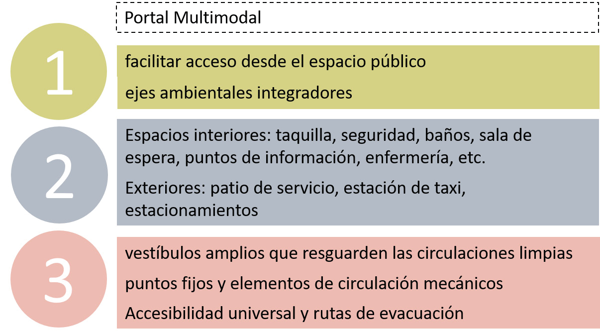 En cuanto al diseño, la distribución de los espacios y la funcionalidad el edificio este debe cumplir como mínimo con los ítem mencionados en (Pautas de distribución espacial para un portal multimodal de transporte.) para su funcionamiento óptimo.