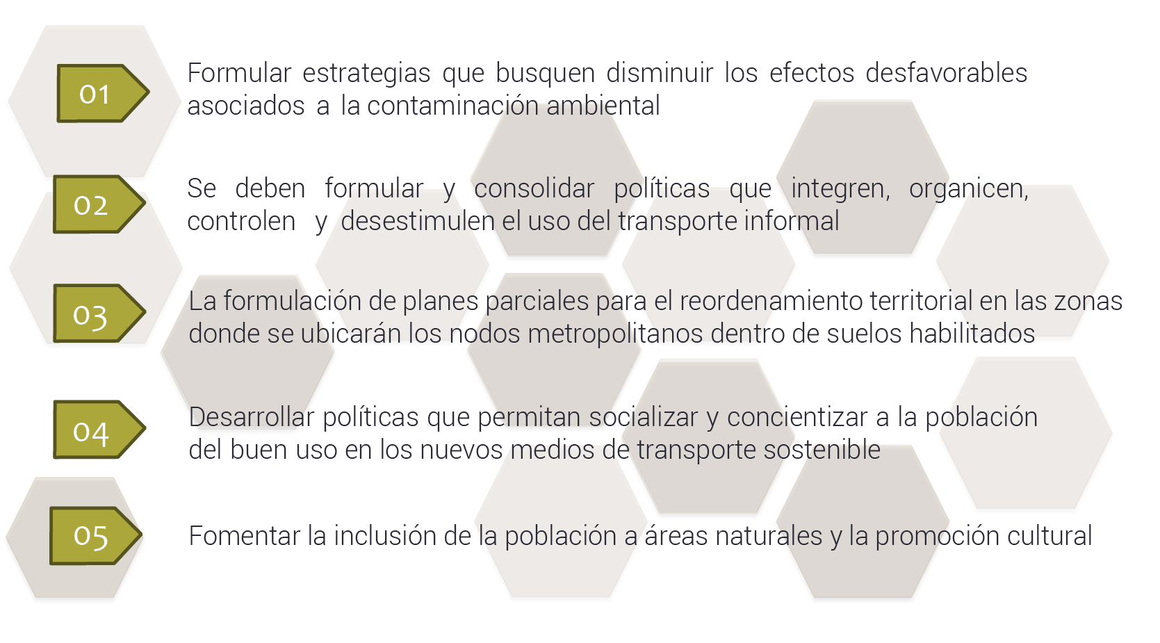 Con todo lo anterior, se evidencia que la movilidad del Área Metropolitana de Barranquilla sufre un desequilibrio en términos de Movilidad Sostenible, por tanto urge la creación de Planes Estratégicos que promuevan la implementación de un Sistema Integrado de Movilidad Urbano Sostenible que acorde a su modelo de ciudad permita renovar su tipología para un mejor aprovechamiento de su infraestructura vial, permitiendo la coherente organización en la integración con otros medios de transporte público, que permitan mejorar aspectos económicos, sociales y ambientales en la población y su territorio; disminuyendo los tiempos de recorrido, aumentando la calidad de los sistemas y la infraestructura vial, dotando la ciudad de un mejor espacio público y zonas verdes que generen cultura ecológica, aplicando políticas urbanas y metropolitanas acorde a los planes de ordenamiento territorial (P.O.T) para el buen funcionamiento y desarrollo del Área.