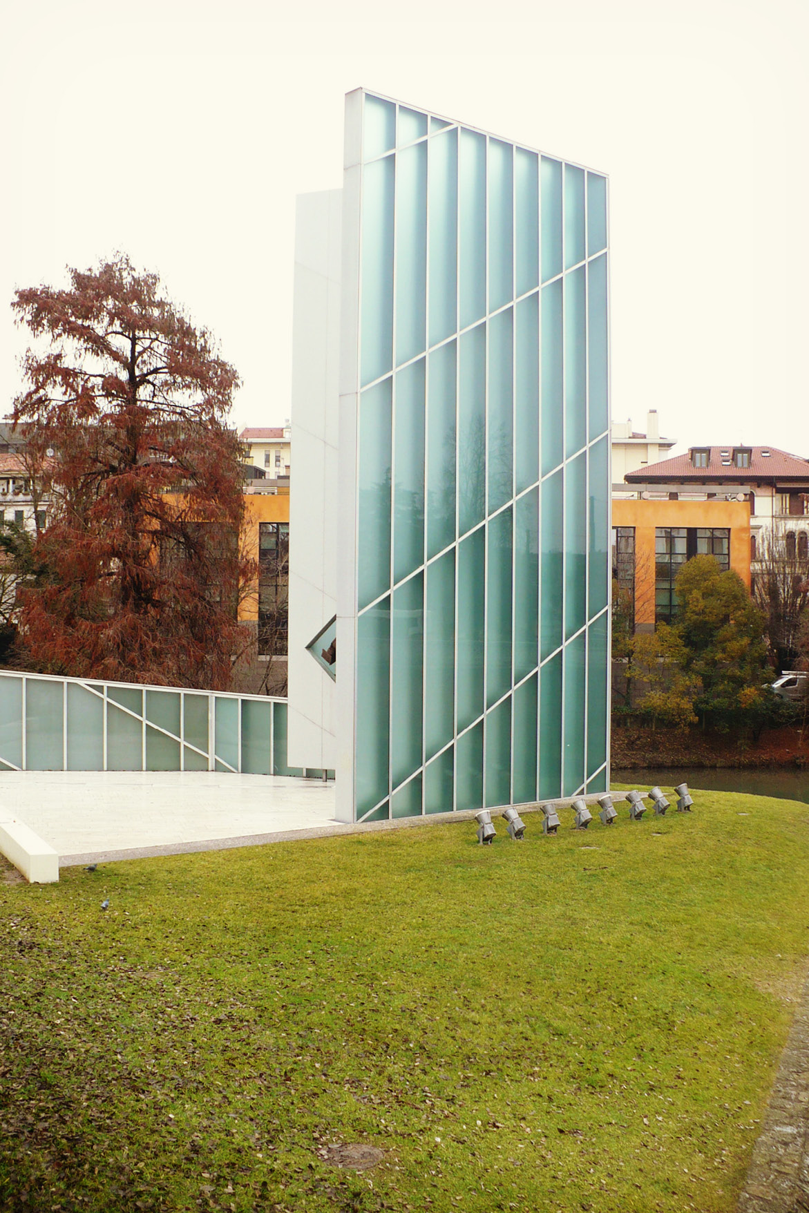 Padova, hoy en día todavía enseña que no se debe temer a la ciencia, que por el contrario se debe temer a la ignorancia y a la intolerancia que son las causas principales de la violencia y del fanatismo. La estructura se compone de una pared de vidrio satinado de 50 mts de largo por una altura variable que va desde los 2 hasta los 5 metros, terminando en una cuña de 17 mts de alto; formada esta, por dos paredes de vidrio a manera de un libro abierto, en una de estas paredes se encuentra incrustada la viga que tiene casi 6 metros. La obra se caracteriza por cambiar de luz y de forma según el ángulo de observación y el punto privilegiado es desde el puente del pueblo que atraviesa el rio del Piovego; el vidrio de toda la estructura fue diseñado apropósito para que se adapte a las exigencias especificas de esta obra arquitectónica, en efecto la luz se hace materia y rediseña los espacios y las formas de manera armónica. La elaboración de todo el complejo implico unas tecnologías de avanzada ya que el vidrio se trato para que al tacto, cuando se tocase diese la impresión de palpar una tela de terciopelo además de ser resistente al medio ambiente, incorruptible e inmutable. El significado conceptual de esta obra de arte y de arquitectura fue explicado en las palabras de Libeskind con la siguiente retorica: La luz de la libertad se torna esplendorosa en el libro de la historia, este libro esta abierto en honor a los héroes del 11 de septiembre, la afirmación eterna de la libertad esta escrita en la famosa estatua de la libertad, también en New York, como ha sido vista por los millones de inmigrantes que llegaron a Norteamérica, en este libro, en la pagina izquierda esta inscrita la viga como elemento dramático del ataque terrorista y se hizo coincidir de manera matemática y de geo posicionamiento la latitud de la ciudad de New York, con el centro de Padova, desde el lomo vertical del libro, este es luminoso como el bajo y expresivo muro que invita en ese lugar a la meditación y la interiorización por la luminosidad de este faro que irradia en ritmos sutiles y además permite que el libro se mimetice entre los edificios históricos de la ciudad delicadamente balanceado entre ellos, el puente, la vía y el sendero peatonal con un plus, el monumento redescubre el patrimonio histórico de las murallas de la ciudad creando un espacio que sea al mismo tiempo un enclave de memoria, de inspiración y de elevación, este magnifico monumento brillara día y noche durante todas las estaciones del año (Figura 12).
