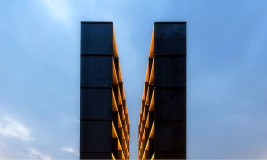 La palabra SHOAH, del lenguaje Hebreo significa, Catástrofe, y fue la comunidad judía de esta ciudad quien promulgo la creación de este símbolo, El memorial esta formado por dos paralelepípedos simétricos de acero no inoxidable de 10 x 10 ms cada uno; los dos elementos geométricos y densos se disponen uno junto la otro con un espacio intersticial a manera de sendero que cambia su ancho de 1,60 m, estrechándose poco poco a solo 80 cm. el ingresar a este recinto amurallado de manera breve crea una sensación en el individuo de opresión, de angustia y de encarcelamiento, los volúmenes de los dos muros de metal tienen una retícula de placas vacías horizontales y verticales que se unen en ángulo recto de 90°, originando unas celdas vacías rectangulares de 1,80 x 1,25 m – el contenido simbólico de estas oquedades es la representación metafórica de las habitaciones de dormir en los campos de concentración. el acero no oxidable es un material que se corroe, se le conoce como acero dulce o acero al carbono, cuando se expone al aire libre se va degradando así las piezas en el pasar del tiempo evidenciaran la patina del oxido, Los elementos, todos en su conjunto crea un ambiente de respecto y de dimensiones melodramáticas donde nuevamente la luz juega un papel importante en los ritmos del memorial, con luz natural, el corredor entre los bloques se disloca en en una luz casi imperceptible dando claroscuros al recorrido, la luz artificial ubicada en puntos estratégicamente seleccionados permite que el recinto adquiera una presencia imponente, poderosa y al mismo tiempo inmaculada donde lo majestuoso se hace metal y concreto en donde se evidencia lo inconmensurable del holocausto, la desmedida acción de sobreponer una ideología sobre otra de modo destructivo y lo que queda después de la destrucción, fragmentos, estos dos fragmentos son un testimonio metafórico de esos hechos que lastimosamente siguen aconteciendo en la sociedad contemporánea.