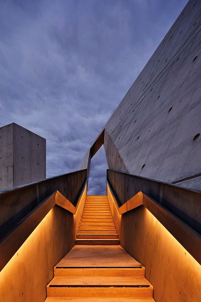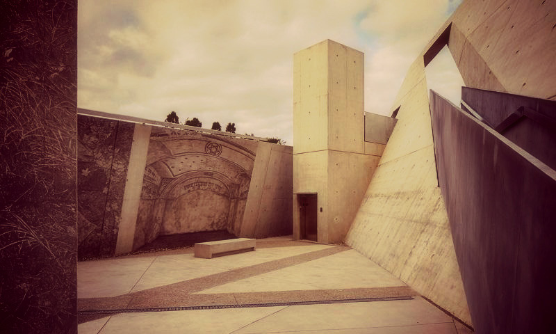 Libenskind se basa en la forma de una estrella de David, una estrella de seis puntas símbolo del judaísmo, y que ha devenido símbolo de las víctimas del Holocausto, al ser, precisamente, una estrella amarilla conformada mediante dos triángulos equiláteros la insignia que marcaba a millones de judíos. La planta, en consecuencia, se forma a partir de seis volúmenes triangulares realizados en hormigón in situ. La forma estrellada que se consigue se adapta a la parcela, mostrando un carácter irregular, casi deformado, de muros inclinados, pasos estrechos y pasajes laberínticos, reflejo del dolor y el sufrimiento. Los espacios triangulares resultantes recuerdan, igualmente, las insignias que marcaban a presos políticos, presos religiosos, testigos de Jehová, homosexuales, gitanos y otros individuos de razas y etnias diversas. El espacio, fragmentado en ámbitos estrechos, alargados, de formas agudas, de salientes y aristas vivas, se convierte en un espacio herido, rasgado. Los muros, que delinean estigmas y cicatrices tridimensionales, encierran un espacio vacío e inerte donde la naturaleza no tiene cabida. El gris absoluto del hormigón ha engullido todos los colores, y sólo el azul sobrevive en lo alto, en el cielo. El interior, acotado por los muros, apenas permite la conexión con el espacio exterior. En su lugar, en determinados puntos se evocan paisajes monocromáticos que, traspasando la dimensión espacio temporal, nos retrotraen a los lugares del Holocausto, a los campos de exterminio, a los paisajes de muerte y ejecución, Que toda esta arquitectura para el recuerdo nos permita conservar todo aquello que no se debe de olvidar.