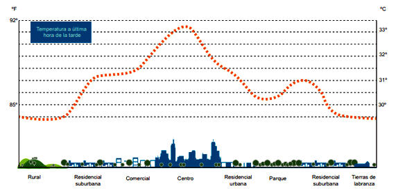 La temperatura del aire en zonas altamente construidas, puede alcanzar más de 33 ºC, mientras que en zonas rurales es inferior a los 29.5 ºC. Las características particulares del clima de las ciudades, como fue mencionado antes, suele llamarse “clima urbano”. La ciudad modifica el paisaje natural de manera significativa transformando el balance de radiación y el contenido de calor en las áreas urbanizadas. Estas modificaciones provocan cambios en la distribución de la temperatura dando lugar a un fenómeno que se conoce como el efecto de la “isla de calor”, que a su vez produce cambios en la distribución espacial de otras variables como la presión atmosférica, los vientos, la nubosidad y la precipitación, así como la distribución de contaminantes y los fenómenos meteorológicos extremos (Conde, Pabón & Sánchez, 2013, p. 29).