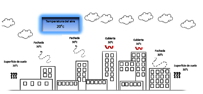 Son múltiples los problemas que la urbanización acarrea, un ejemplo de esto son las llamadas “Islas de Calor” (Galindo & Uribe, 2012). Se define isla de calor urbana (ICU) a la diferencia de condiciones climáticas registradas por un observador situado en la ciudad frente a otro observador localizado en su entorno rural (Oke, 1987). La isla de calor urbana es uno de los efectos del calentamiento global a nivel local, caracterizado por el aumento de la temperatura en espacios urbanos. La isla de calor urbana es una situación urbana de acumulación de calor en los centros urbanizados de las ciudades, debido a elementos urbanos como edificaciones, superficies absorbentes de calor, superficies de baja reflectancia, sistemas de transporte, falta de vegetación, materiales absorbentes de calor, y falta de ventilación. Esos factores influyen directamente el balance de la temperatura generando un desequilibrio en el microclima urbano. Esto estimula que la población explore alternativas para satisfacer su necedad de confort buscando mecanismos de enfriamiento que a su vez generan más acumulación de calor.