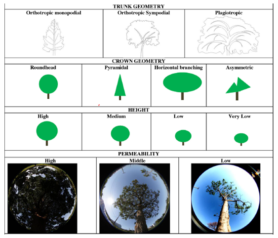 Según la geometría del tronco, un árbol puede ser ortrópico monopodial, ortotrópico simopodial y plagiotrópico; en cuanto a la geometría de la corona este puede ser de cabeza redonda, piramidal, ramificación horizontal y asimétrico; finalmente, un árbol por la altura se clasifica en alto, medio, bajo y muy bajo. Estas formas de arborización son importantes en la definición de las tipologías urbanas a simular en la investigación, que permiten analizar los efectos de la vegetación en el microclima urbano. El diseño urbano debe disponer de criterios bioclimáticos donde la vegetación sea un fundamento de la planificación de la ciudad.