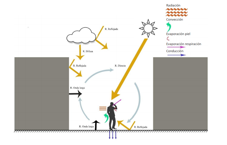 Por su parte, la incidencia de radiación solar también influye en el confort térmico de los individuos, debido a las transferencias de calor e intercambio de energía. Las trasferencias de calor se pueden categorizar en procesos de conducción-convección del aire y de radiación; el intercambio de calor por convección ocurre por la circulación del aire alrededor del cuerpo humano. Con respecto a los intercambios por radiación, estos dependerán de las temperaturas del cuerpo humano y de las temperaturas de las superficies adyacentes, ya que éstas irradian calor dependiendo principalmente de las características térmicas de sus materiales y de la radiación solar recibida. En condiciones exteriores, el intercambio radiante del cuerpo humano con el ambiente tiene especial importancia debido a la exposición a la radiación solar, la fría bóveda celeste y las cálidas y frías superficies urbanas (Figura 11) (Cordero, 2014).