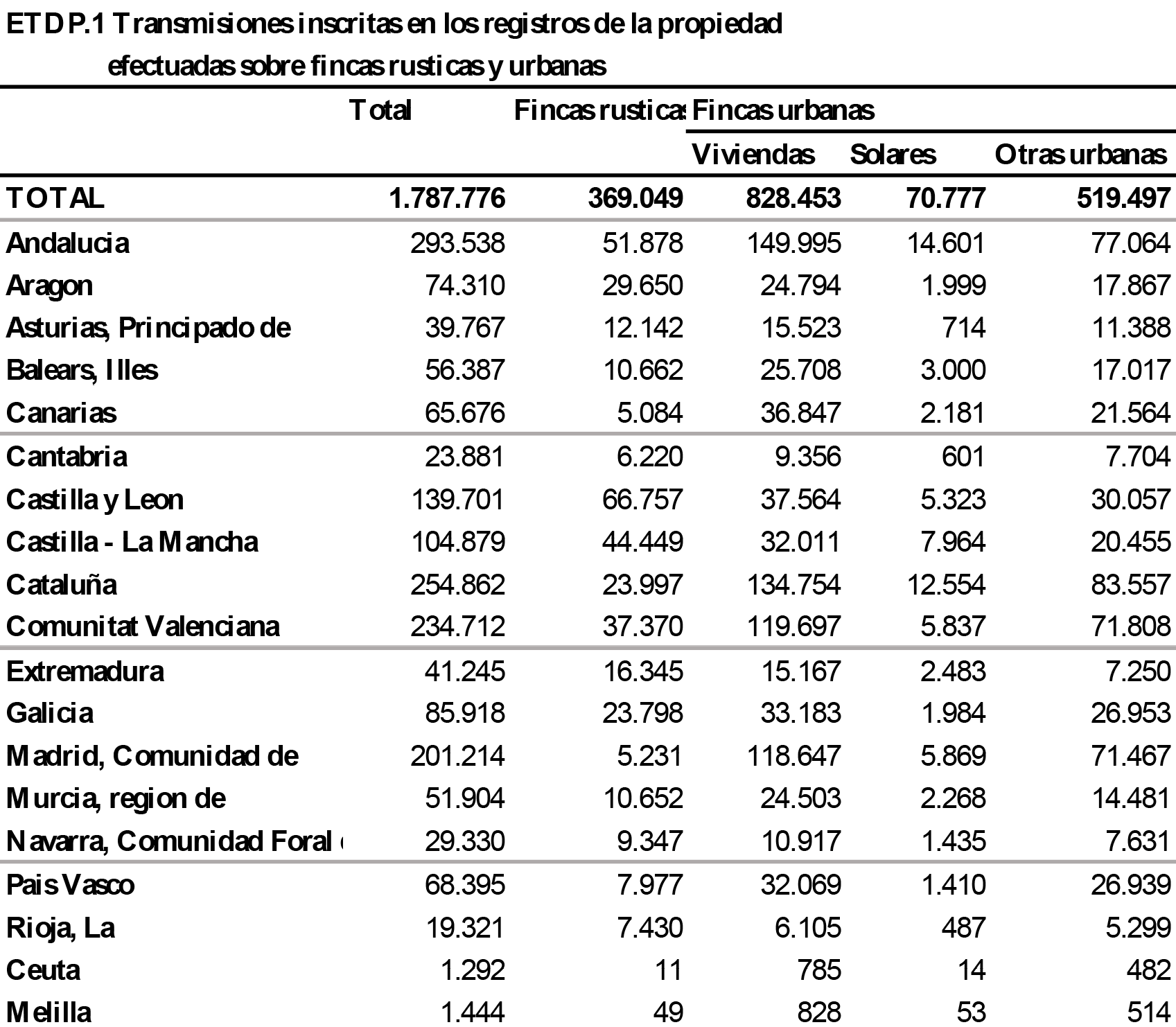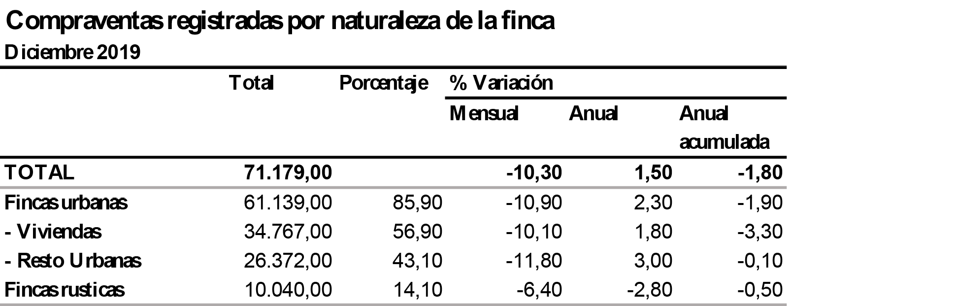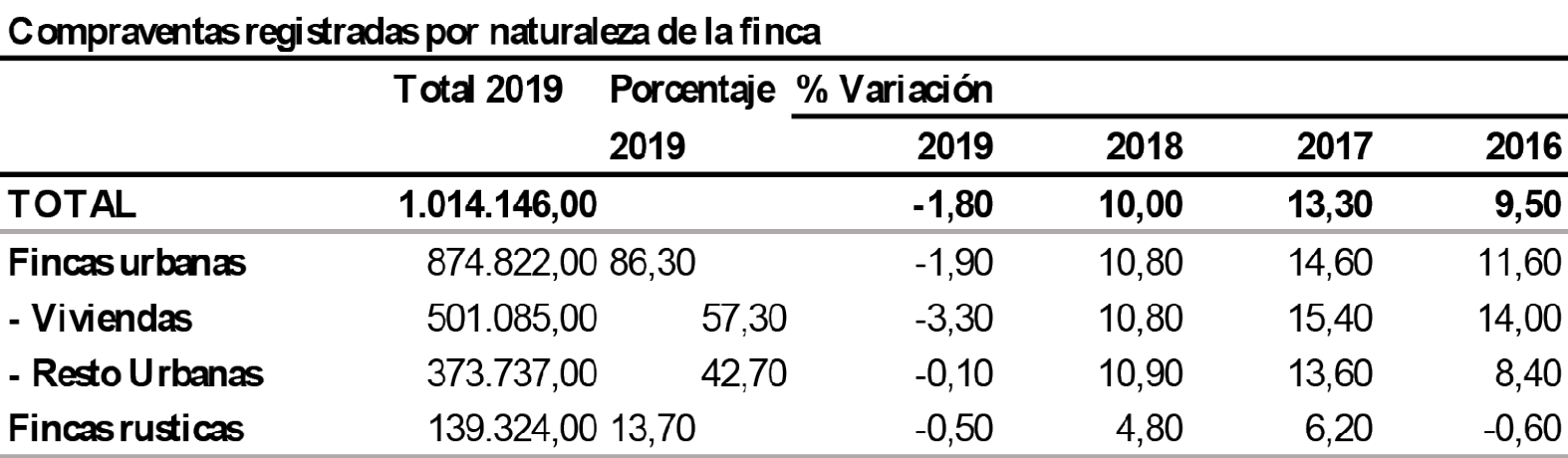 “El 86,3% de las compraventas registradas en el año 2019 correspondió a fincas urbanas y el 13,7% a rústicas. En el caso de las urbanas, el 57,3% fueron compraventas de viviendas. Las compraventas de fincas rústicas disminuyeron un 0,5% y las de fincas urbanas un 1,9%. Dentro de estas últimas, las compraventas de viviendas bajaron un 3,3%”. Lo que advierte que la trasmisión de fincas se realiza en el entorno urbano, se realiza en el suelo consolidado y no en suelos rústicos, más explícitamente los datos demuestran como el mercado inmobiliario del suelo se está moviendo hacían la ciudad consolidada y no hacia una transformación del suelo rustico, transformaciones típicas de un modelo desarrollista anterior y demostrado obsoleto (Tabla 2).
