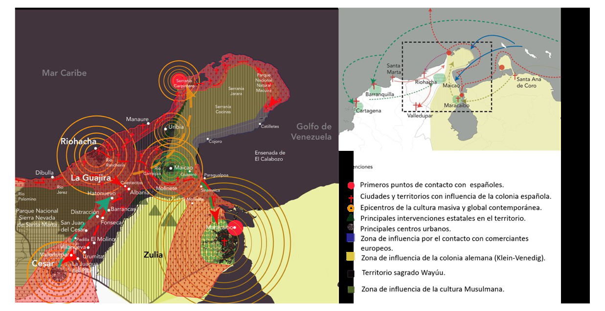 Se entiende entonces a La Guajira como un receptáculo y un escenario del devenir Wayúu. La península a través de la historia ha sido punto de encuentro de una gran cantidad de culturas, que han sido protagonistas en la dinámica ocupacional, y el poblamiento de la región, hecho que a la postre, se ve como el factor crucial del que depende el carácter híbrido y multicultural de la esencia Guajira (Figura 3).