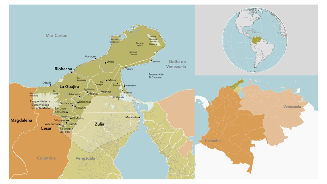 Ahora bien, La Guajira es el departamento más al norte de subcontinente suramericano, ubicado en Colombia, su capital es Riohacha y Uribia, la ciudad con mayor población Wayúu del país. Por el norte limita con el mar Caribe, por el oriente con el Golfo de Venezuela; y con el departamento del César; al occidente con el mar Caribe y con el departamento del Magdalena. En Venezuela el Municipio indígena bolivariano Guajira es uno de los 21 municipios del estado de Zulia, y se ubica al norte del estado, su capital es Sinamaica. Esta división política entre países ha generado una fractura en el territorio pues la comunidad Wayúu lo concibe como una unidad y es por ello que La Guajira colombo-venezolana conforma lo que las comunidades Wayúu llaman, la Gran Nación Wayúu. Este espacio geográfico y étnico es para los Wayúu el Wo’Main (Nuestra Tierra) o Woummainpa (nuestra tierra desde siempre) (Figura 4).