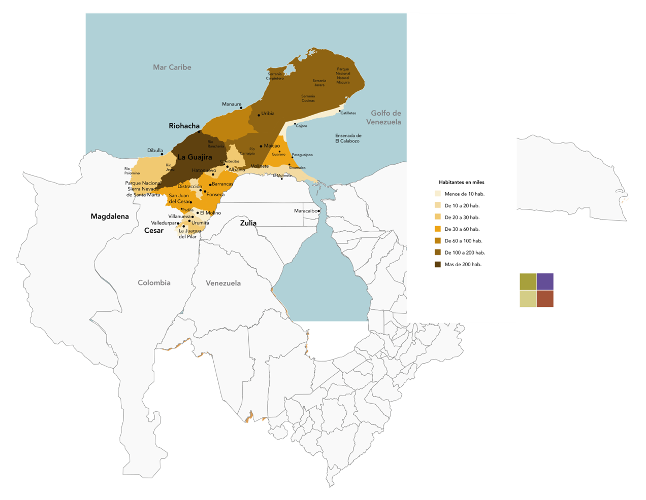 Los Wayúu son reconocidos por ser la comunidad étnica más numerosa colombo-venezolana; representan cerca del 8% de la población del Estado de Zulia y cerca del 45% de la población del departamento de la Guajira según los datos del censo 2011 respectivamente. El poblamiento del territorio está intrínsecamente relacionado con los cambios estacionales, pues durante la estación seca, muchos Wayúu buscan trabajo en territorio venezolano o en otras ciudades o pueblos y en la temporada de lluvias muchos retornan a sus rancherías (Figura 6).