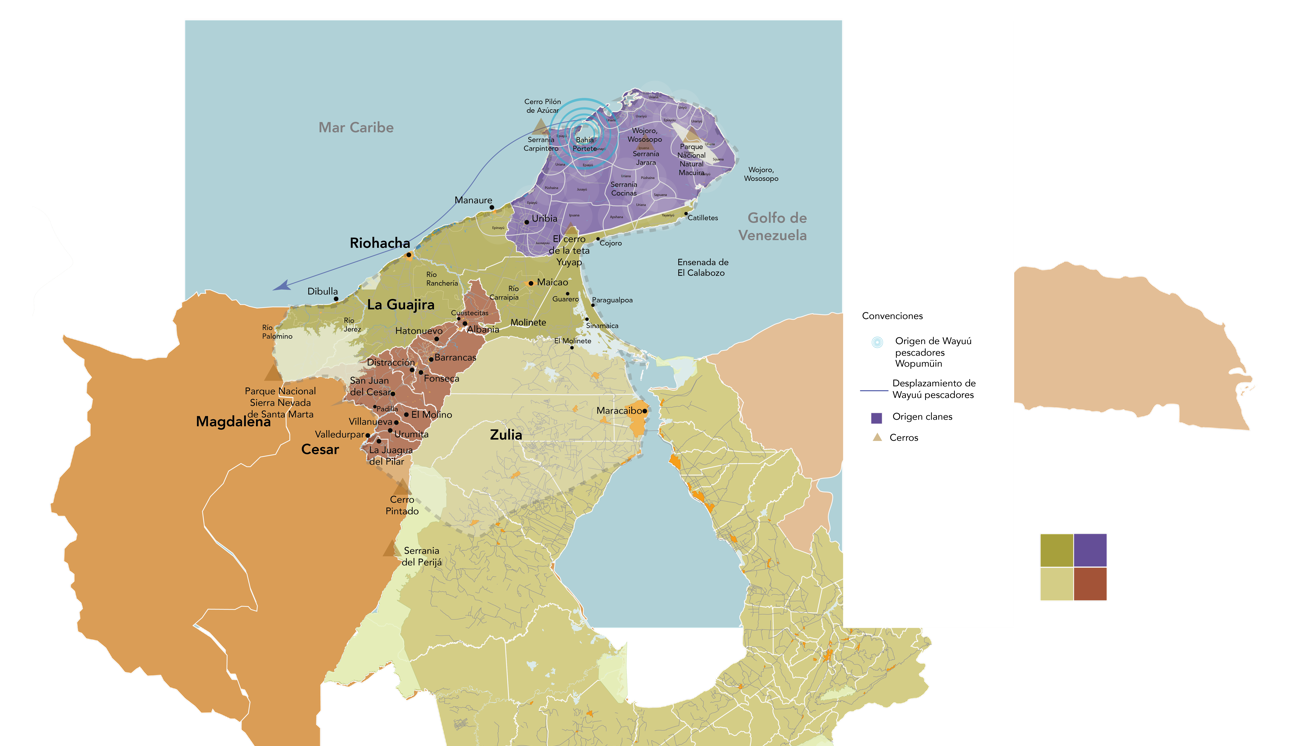 Esta aproximación inicial y la revisión de estos procesos históricos y culturales nos permitió entender a La Guajira como un territorio polisémico, pues se trata de un lugar donde han confluido dos culturas, lo Wayúu y lo Arijuna (occidentales), con procesos de intercambio y mestizaje en amplios períodos de tiempo; donde se encuentra además el borde y confín de dos estados nacionales y sus representaciones de frontera, es decir, los departamentos de La Guajira y el Estado del Zulia. Encuentro que produce como resultado formas de habitar híbridas, asociados o permeados a las dinámicas del Mar Caribe como trasegar de imaginarios identitarios, económicos y políticos, un mundo anclado ancestralmente a una cosmovisión mágica arraigada a estos parajes y otro de características occidentales, marcado por procesos de colonización e hispanización, de dominio y explotación económica. Es por ello que, escribir de La Guajira necesariamente implica estudiar la cosmogonía de las comunidades que allí habitan, la cual constituye la «manera de ver e interpretar el mundo» (Ferrater, 2001, p. 701) y las transformaciones que las dinámicas histórico culturales han llevado.