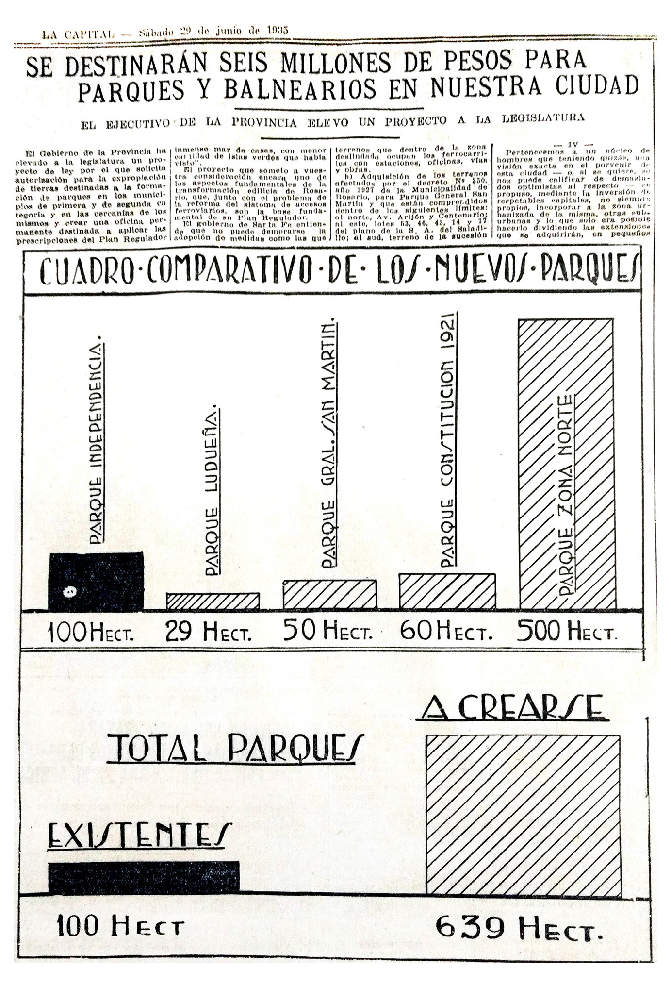 En 1935 dos acontecimientos activarán ambiciones respecto a la concreción de tantos proyectos frustrados: la sanción de la Ley Provincial de Creación de Parques bajo la gobernación del Dr. Luciano Molinas y la aprobación del Plan Regulador y de Extensión de Rosario. El 29 de junio La Capital publica el proyecto de ley que autoriza la emisión de títulos de crédito público destinados a la expropiación de tierras para la formación de parques y crea la Oficina de Urbanismo Regional de la Provincia, dependiente del Ministerio de Hacienda y Obras Públicas.