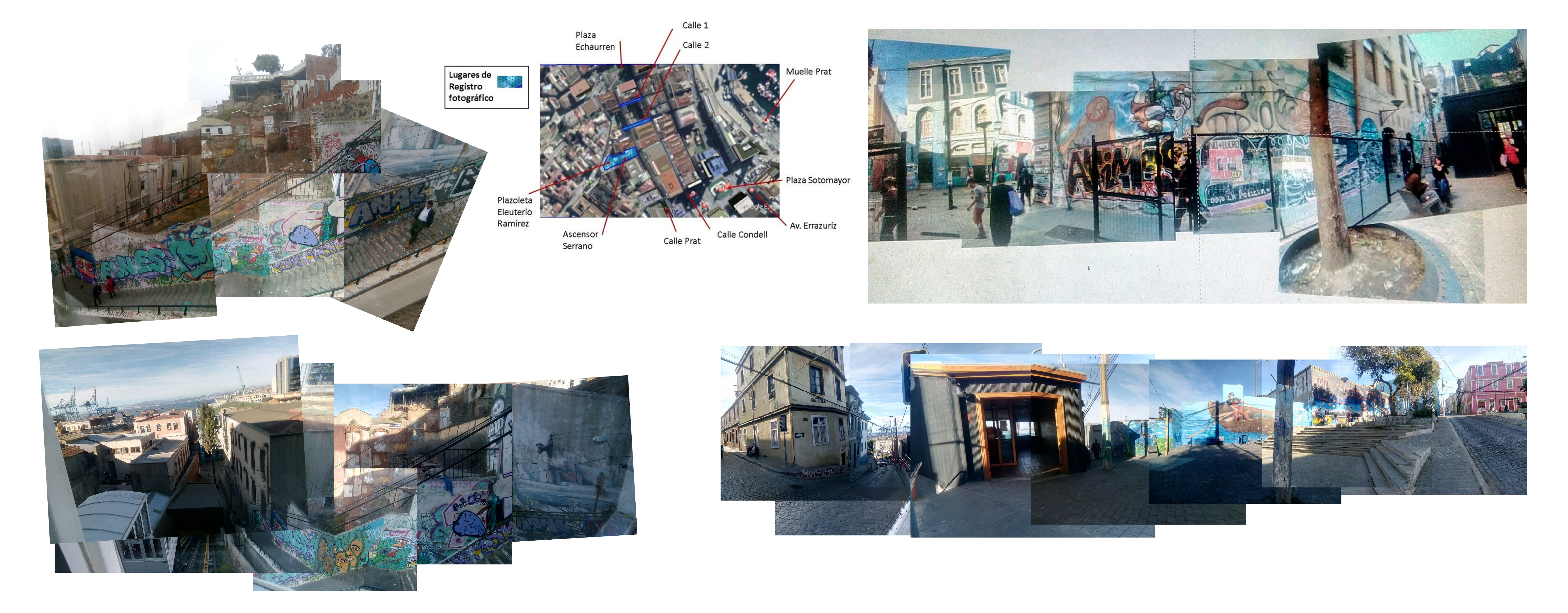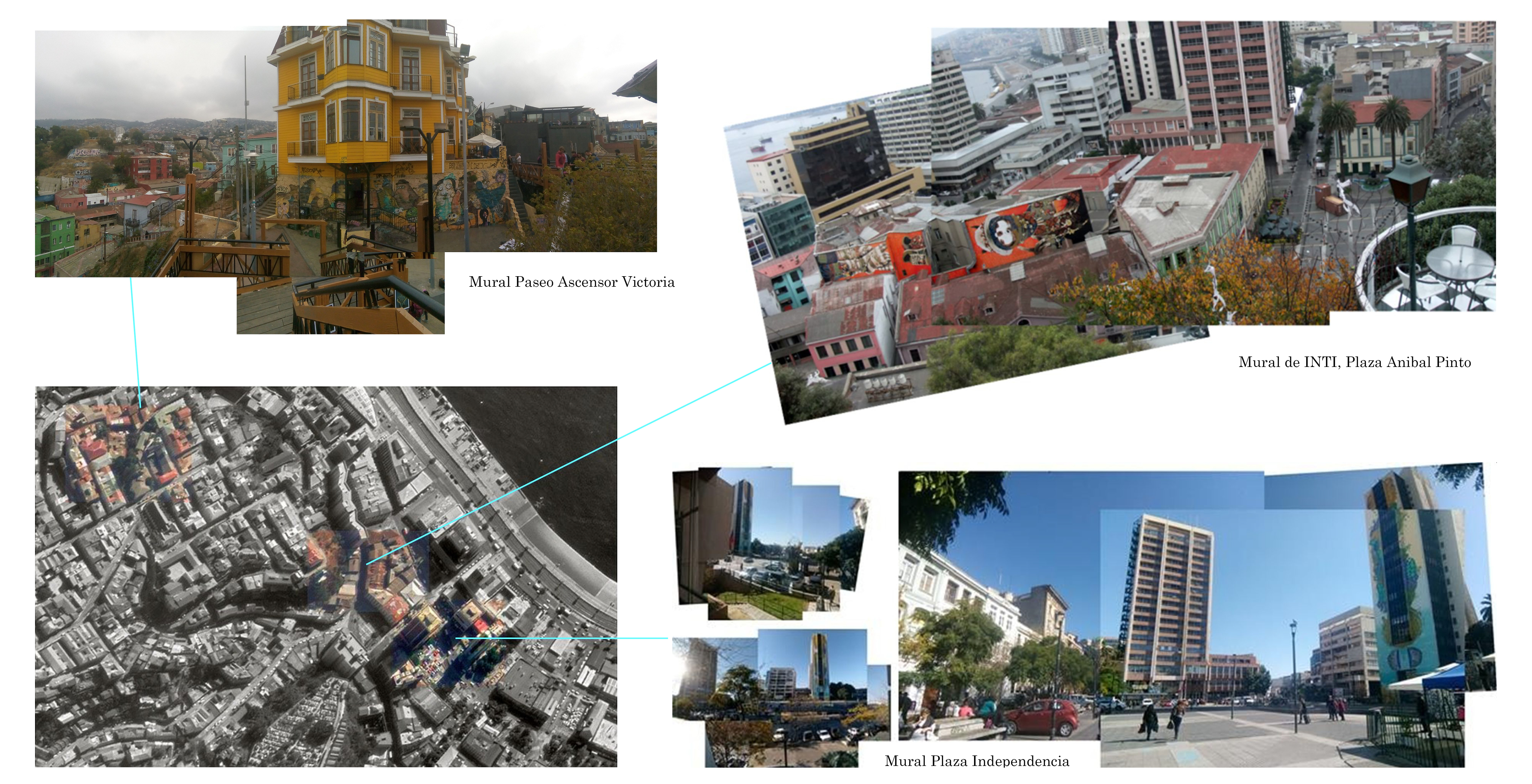 Una tipología que, en segundo lugar, se apoya en registros fotográficos asociados a criterios de composición múltiple. Dada configuración geomorfológicas de los lugares seleccionados, y principalmente el radio de visión y alcance que estos tienen dentro de la trama urbana. Es así como las composiciones son el resultado, de cambios de visión, a partir de un mismo punto, de los grados de visión que alcanzan a ser vistos en dicho lugar. Por lo mismo, el radio de las composiciones fotográficas, abarca entre 60 y 190 grados aproximadamente. Esto es altamente significativo, pues se trata de mostrar y dar cuenta del impacto visual que tienen los murales en los lugares emplazados, al ser vistos desde varios sectores a la vez.