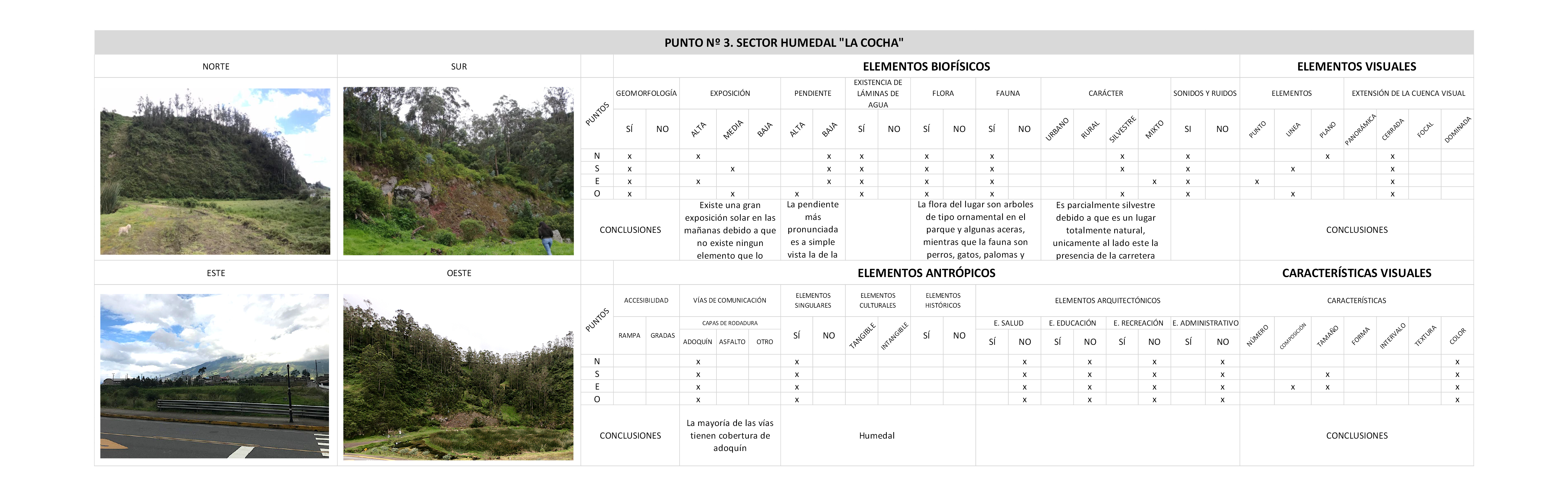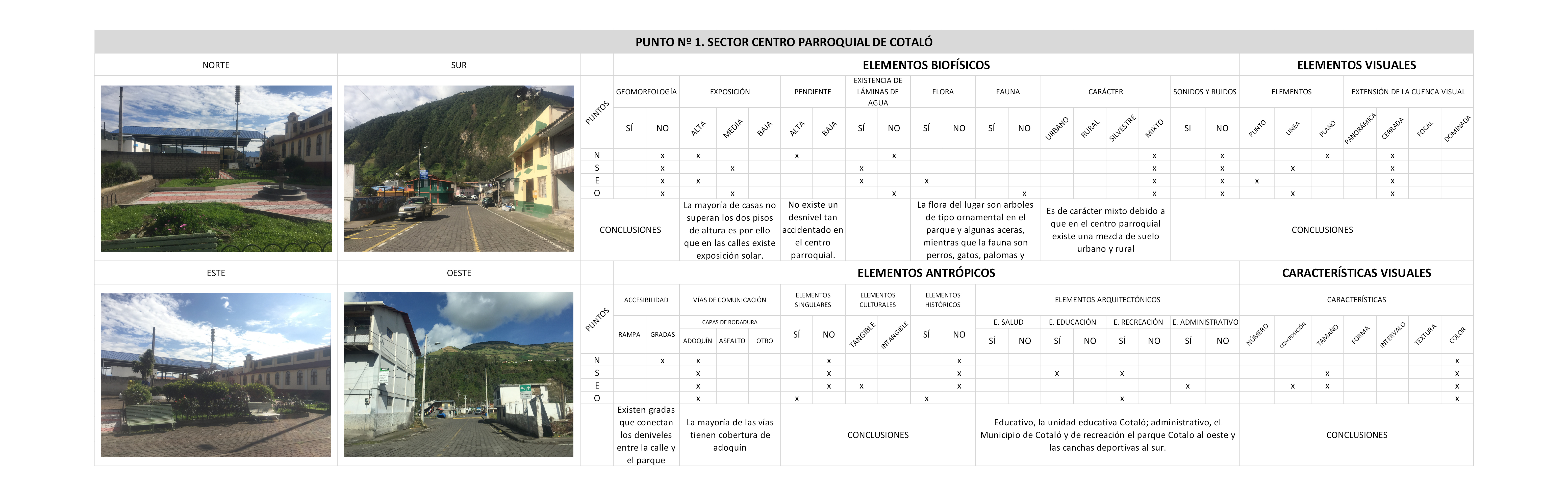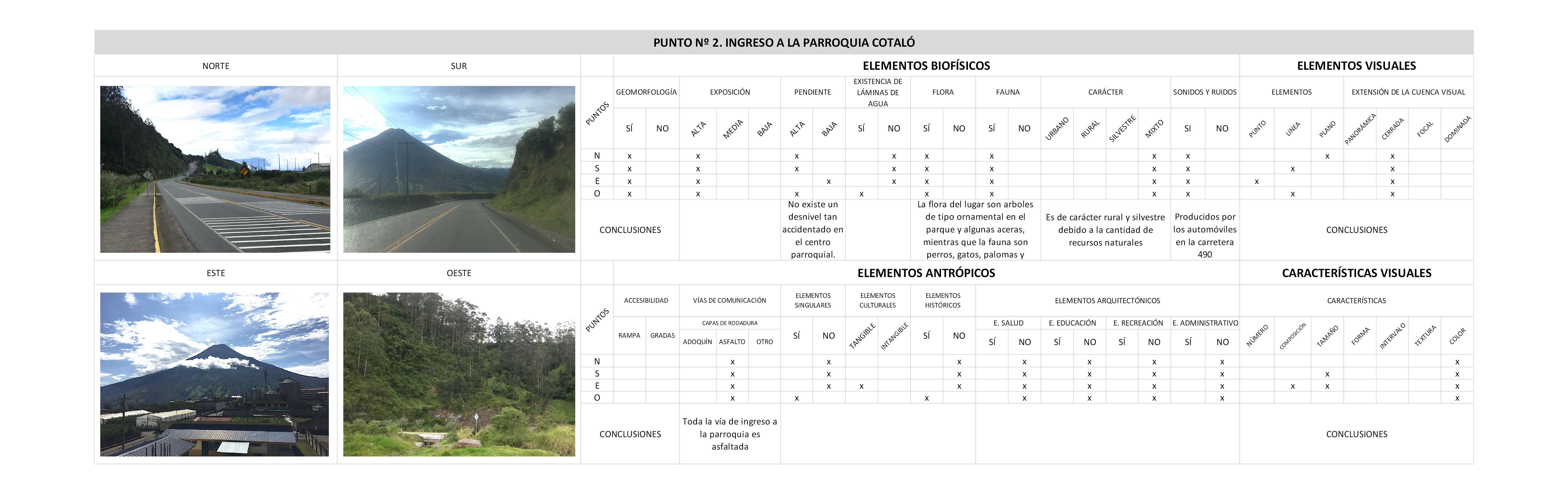 A fin de que, el objetivo de la presente investigación se cumpla, se fijaron seis puntos relevantes dentro de la parroquia, en los mismos que se analizan los diferentes componentes, las condiciones de los elementos biofísicos (geomorfología, exposición, recursos hídricos, flora, fauna); antrópicos (accesibilidad, vías de comunicación, elementos singulares, culturales, arquitectónicos); que se constituyen en indicadores de evaluación donde se exponen sus características, sus ventajas y sus desventajas del territorio de estudio. Este análisis se determinó con la construcción de las tablas de valoración paisajística. en donde se evidencia la gran riqueza de los recursos naturales, culturales e históricos de Poaló para promover la protección a través del desarrollo turístico gracias a sus características físico-espaciales y que se encuentran establecidos en el PDOT de la Parroquia Rural Cotaló (2015).