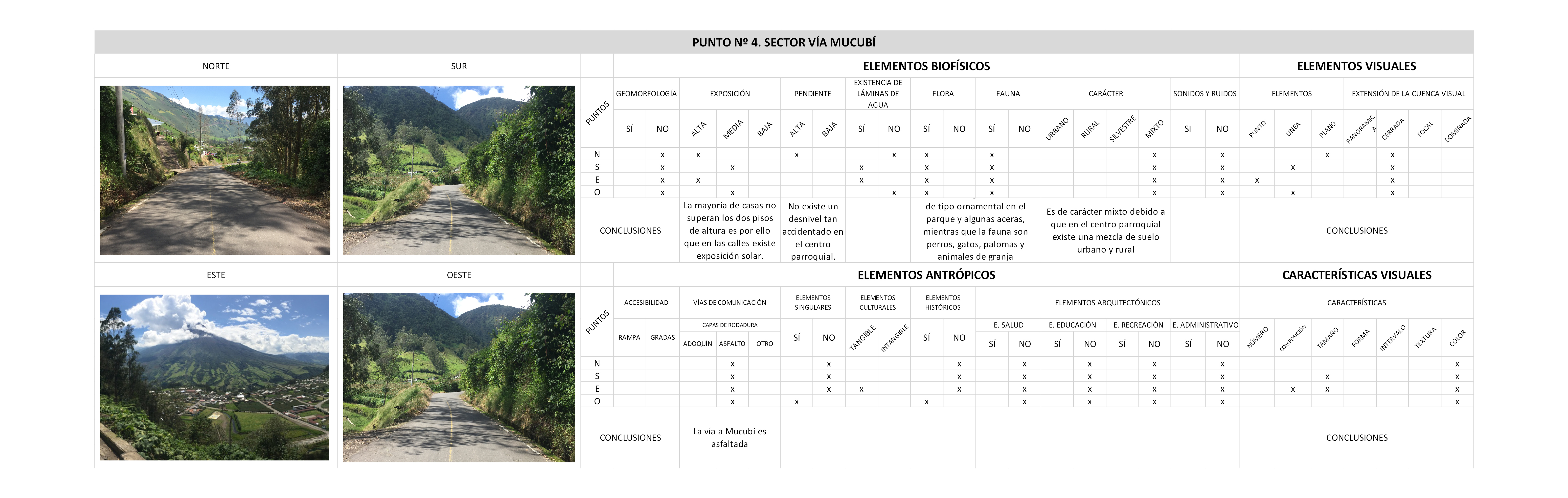 Cabe destacar que, en este caso el tratamiento del nivel parroquial debe se lo realiza en coordinación con los anteriores niveles. De igual manera, la percepción de los habitantes son importantes como “por medio de su paisaje permite construir una serie de imágenes que resaltan rasgos, hitos y particularidades de mayor reconocimiento e identidad” (Wiesner, Puerto, Galindo, Arriaga y Salazar, 2019). Si bien es cierto, una de las características del paisaje es integral para el estudio de este paisaje singular, se determinó los componentes visuales, biofísicos y visuales con sus diferentes elementos. Cabe recalcar que, la población de los sectores rurales conoce su territorio, identifican y reconocen sus características por ser parte de sus actividades cotidianas y vidas.