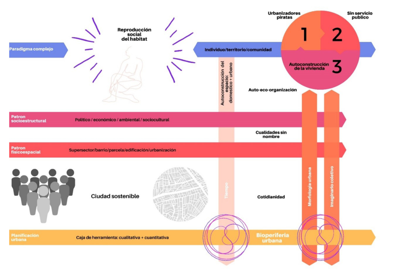 Este articulo explora la forma de reproducción socioespacial del hábitat a partir de la organización espontánea de los asentamientos informales, ya que la planificación urbana estatal se convierte en marginalización de las formas de organización de los asentamientos populares. Por esta razón se propone la Bioperiferia urbana como modelo teórico-práctico para comprender las practicas inherentes de la participación colectiva y organización popular del territorio, que conlleva a la consolidación de diferentes formas y paisajes alternativos como consecuencia de las dinámicas físico-espaciales. La metodología tiene un enfoque mixto: cualitativo y cuantitativo. La primera categoría de la investigación evalúa la morfología urbana, la segunda categoría se reconocen las formas de transformación espacial y el imaginario popular de sus habitantes. Estas dos categorías de estudios resignifican los valores y procesos de producción del espacio autoconstruido que determina la lógica de ocupación y organización popular ligada con las acciones directa de los residentes para mejorar su vecindario.