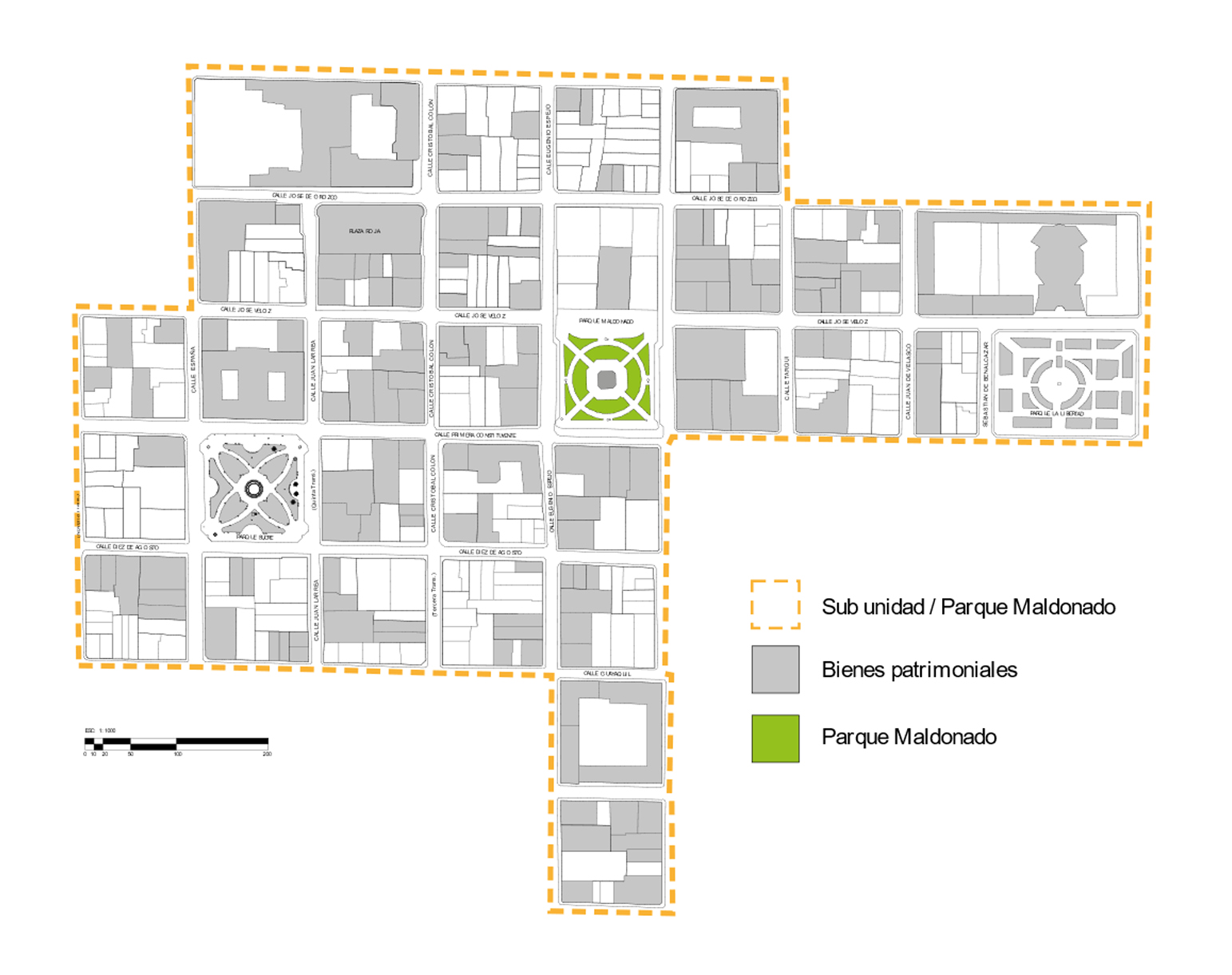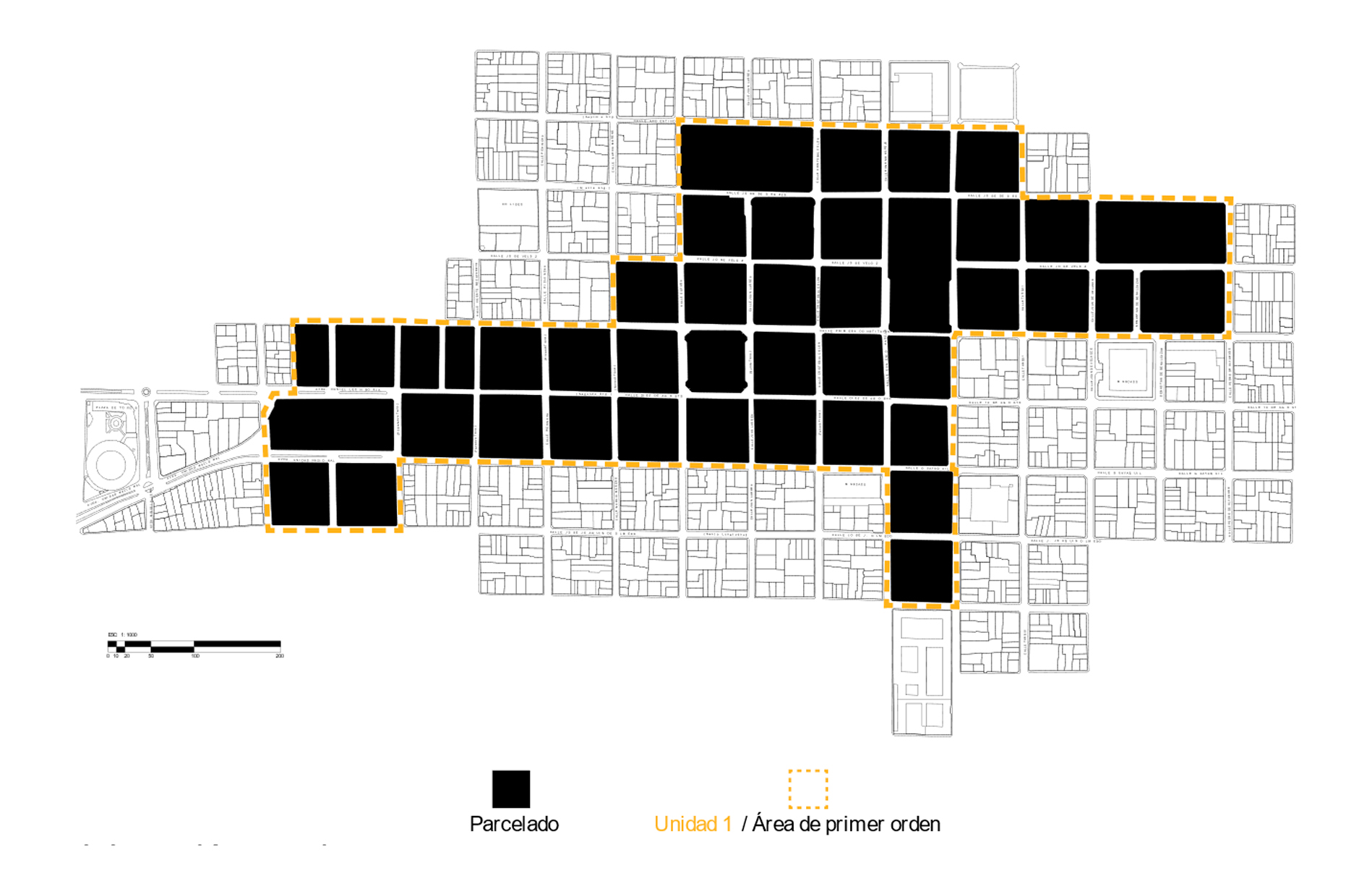 El área de primer orden está organizada en una retícula ortogonal, que parte como eje central el parque Maldonado y la catedral, para la consolidación y expansión urbano del centro histórico. La mayoría de las manzanas son del mismo tamaño de 80 m × 80 m, a diferencia de ciertas manzanas: la estación del ferrocarril y la Plaza Roja que son el doble (Figura 4).