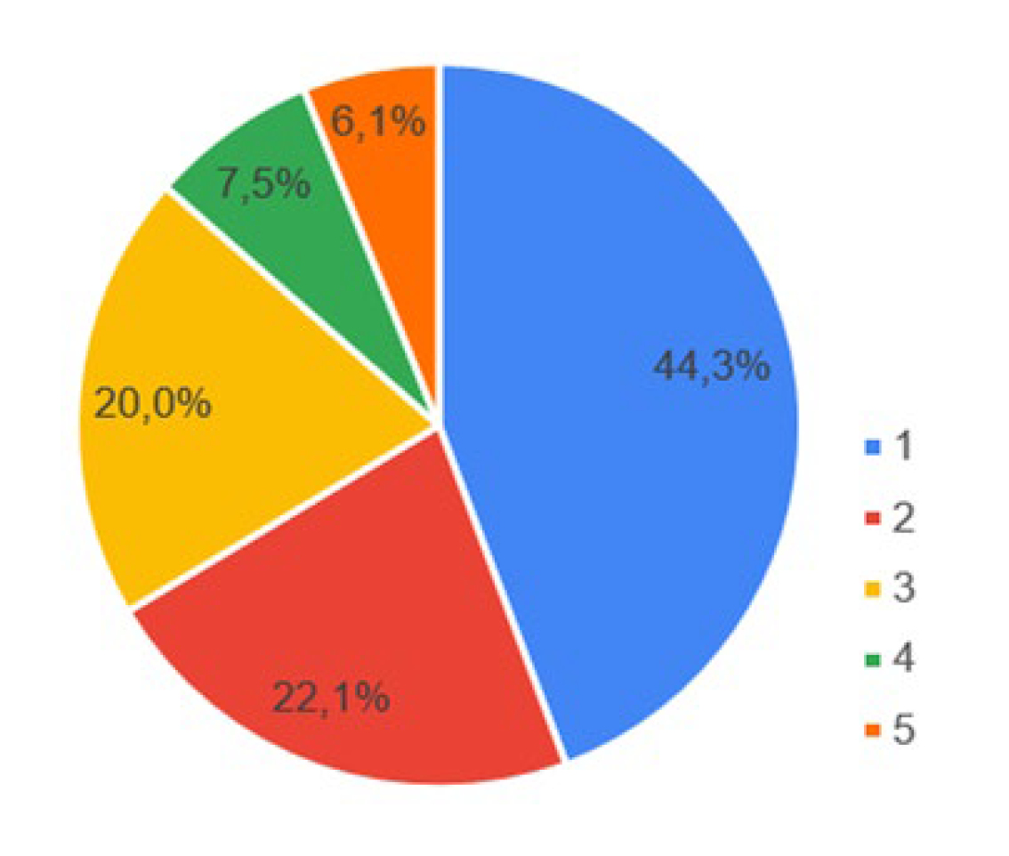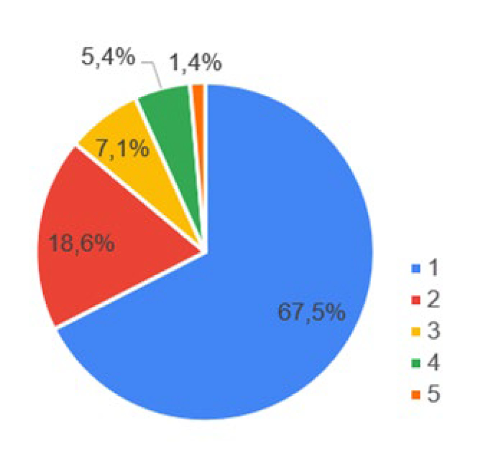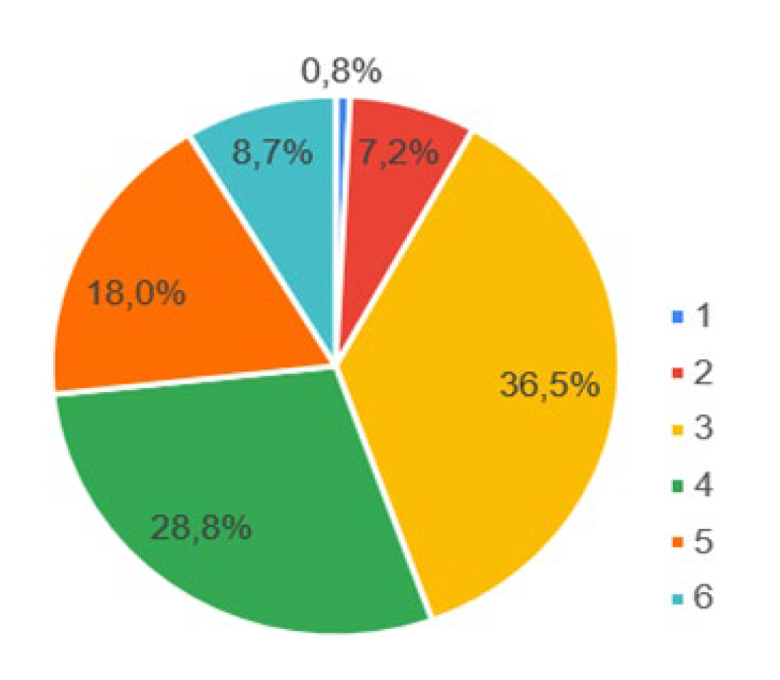 Con respecto a las condiciones olfativas, en la Figura 6 se recopilan las respuestas relacionadas con la pregunta 4.1: (Califique su espacio de trabajo según los olores, siendo 1 un lugar con condiciones agradables desde el punto de vista del olor y 5 un lugar con condiciones poco agradables o inadecuadas desde el punto de vista del olor), la cual refleja que más de la mitad de las personas entrevistadas (67.5%), perciben que su lugar de teletrabajo no tiene ningún tipo de malos olores y, solo un 1.4% considera que en sus viviendas, especialmente en sus espacios para el teletrabajo, suelen tener olores poco agradables.