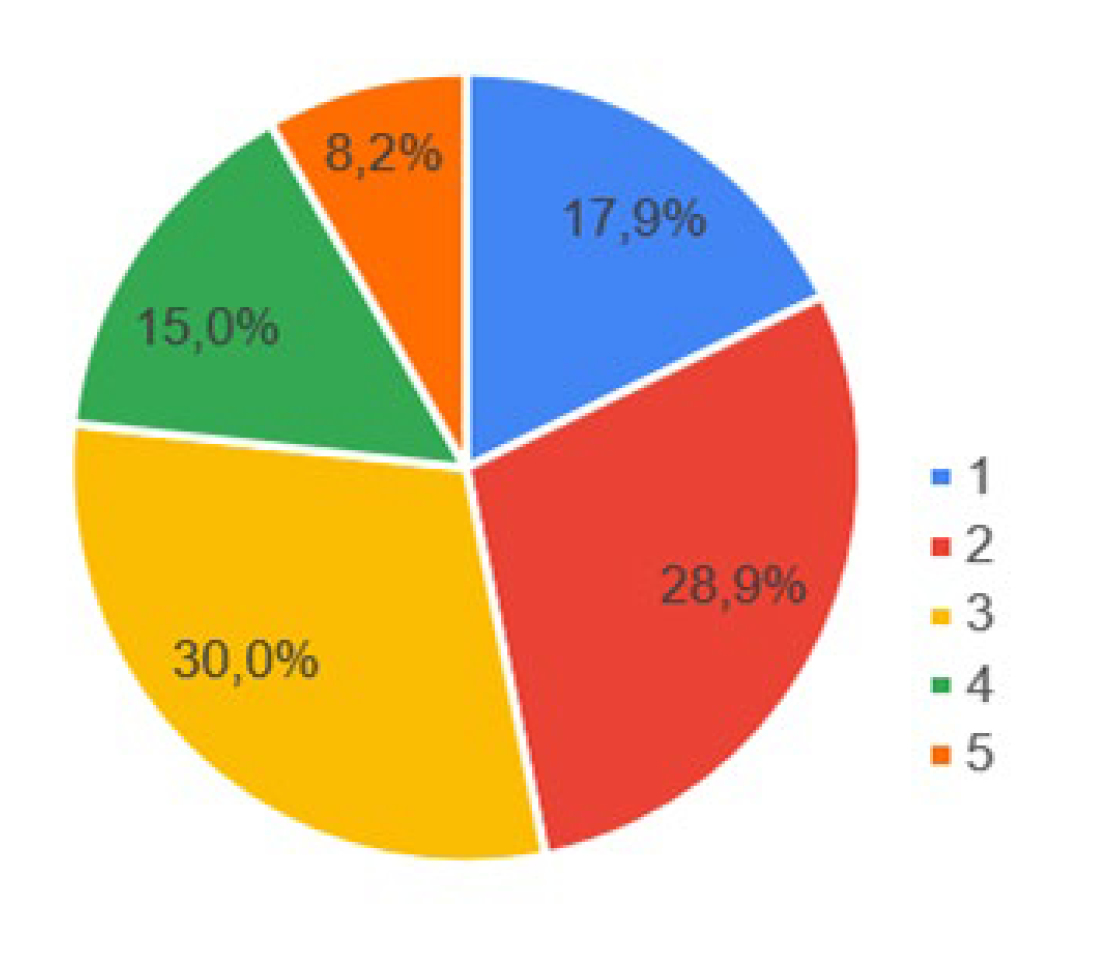 En la Figura 4 se recopilan las respuestas a la pregunta 2.1: (Califique su espacio de trabajo según el nivel de ruido de fondo, siendo 1 un lugar con poco o nulo ruido incómodo y 5 un lugar con mucho ruido incómodo), la cual refleja que la mayoría de personas (30% y 28.9%), perciben su espacio de trabajo con niveles de ruido de fondo entre 1 y 2, lo que significa que, desde su percepción, tienen buenas condiciones acústicas en sus viviendas.