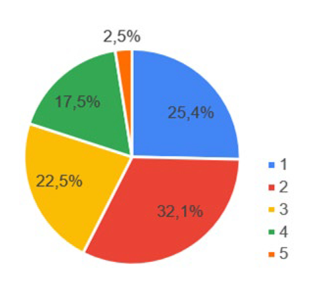 La Figura 5 agrupa las respuestas a la pregunta 3.1: (Califique su espacio de trabajo según las condiciones térmicas, siendo 1 un lugar térmicamente muy cómodo y 5 un lugar térmicamente muy incómodo), en donde se observa que, desde el punto de vista térmico, la mayoría de personas consideran que su lugar de teletrabajo tiene condiciones térmicas apropiadas, ya que, el 32.1 % lo califica en 1, el 25.4% lo califica en 2, y apenas un 20% lo califica entre 4 y 5.