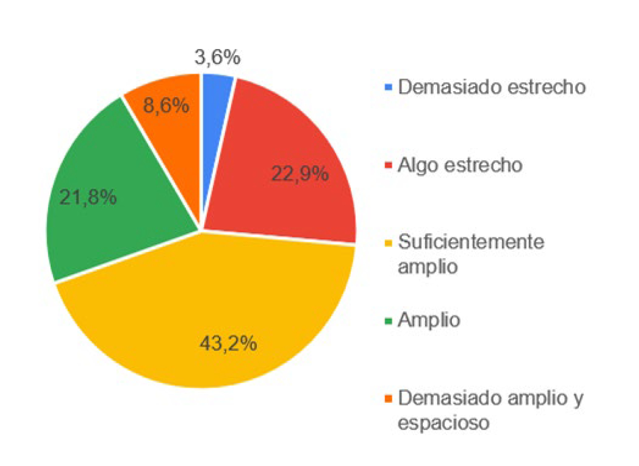 Al analizar las respuestas de la pregunta 6.1: (¿Cómo describiría el espacio donde usted estudia o trabaja en casa?), se concluye que, la percepción del espacio en donde realizan las actividades de teletrabajo es muy buena, pues, la mayoría de personas entrevistadas, 43.2% considera que es Suficientemente Amplio, un 21.8% percibe su área Amplia, y solo un 3.6% dice sentir su espacio Demasiado Estrecho (Figura 8).