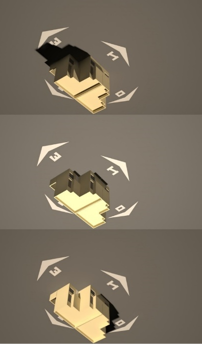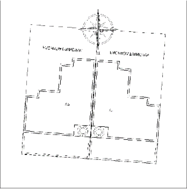 En esta disposición, las viviendas están más cerca de la orientación recomendada por Baruch Givoni (Figura 16), en verano las fachadas principales se encuentran protegidas, pero por la forma y disposición de las viviendas tienen algunas condiciones que provocan una pequeña desventaja en una de las viviendas, obstruyendo el asoleamiento en invierno (Morales, 2011a; 2012a).