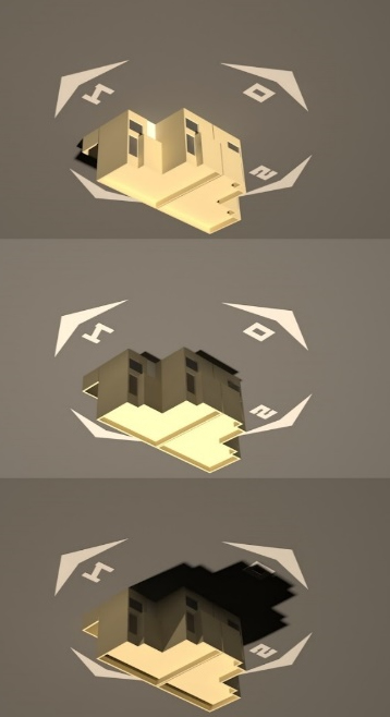 En invierno: se puede observar que, por la forma y disposición de las viviendas solo una vivienda es beneficiada por el asoleamiento, siendo esta misma quien obstruye parte del asoleamiento a la vivienda inmediata, esto asociado a la mala configuración de su forma, el asoleamiento no es equitativo. Las áreas de la vivienda beneficiadas por el asoleamiento son la sala, comedor y las recamaras “1” y “2” de la vivienda más cerca del sur.