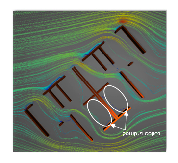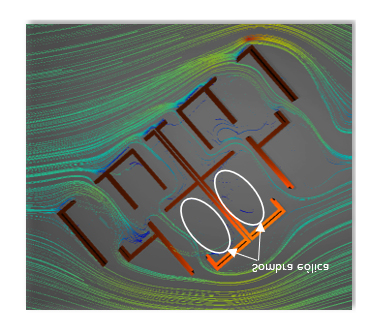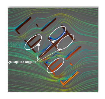 Imagen experimental del comportamiento del viento procedente del noreste en planta baja con fachada orientada al sur. |