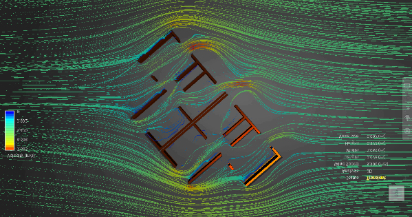 En la siguiente simulación de viento se realizó por Autodesk CFD (versión 2021), el cual observamos como ingresan el aire a la vivienda por los vientos provenientes del noreste, los cuales son los vientos dominantes de la ciudad de Poza Rica. Para esta primera practica se realiza del norte y noreste de los meses febrero a octubre, y se puede prestar atención a estos meses que son los más calurosos, primeramente, se realiza el análisis de la planta baja y vemos como el viento afecta principalmente a la sala de la vivienda próxima al Este dotando a esta área de buena ventilación. Los comedores, a pesar de que el viento corre entre ellos por uno de sus lados, se crean sombras eólicas en estas áreas donde es la entrada y salida del viento, estas zonas están mal configuradas y lo que hacen es evitar que el viento sea distribuido en el espacio.