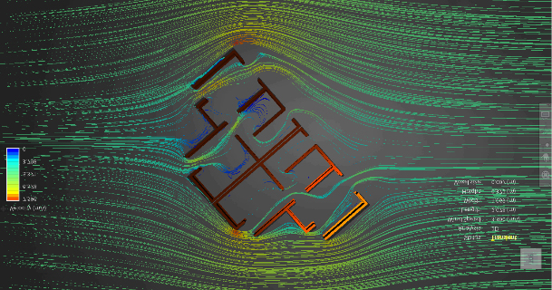 Imagen experimental del comportamiento del viento procedente del noreste en planta baja con fachada orientada al norte. |