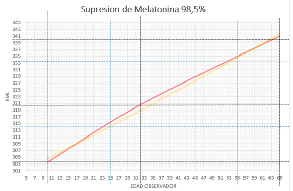 Curva ponderada del 98.5% de supresión melatonina según la edad y la dosis de luz. |