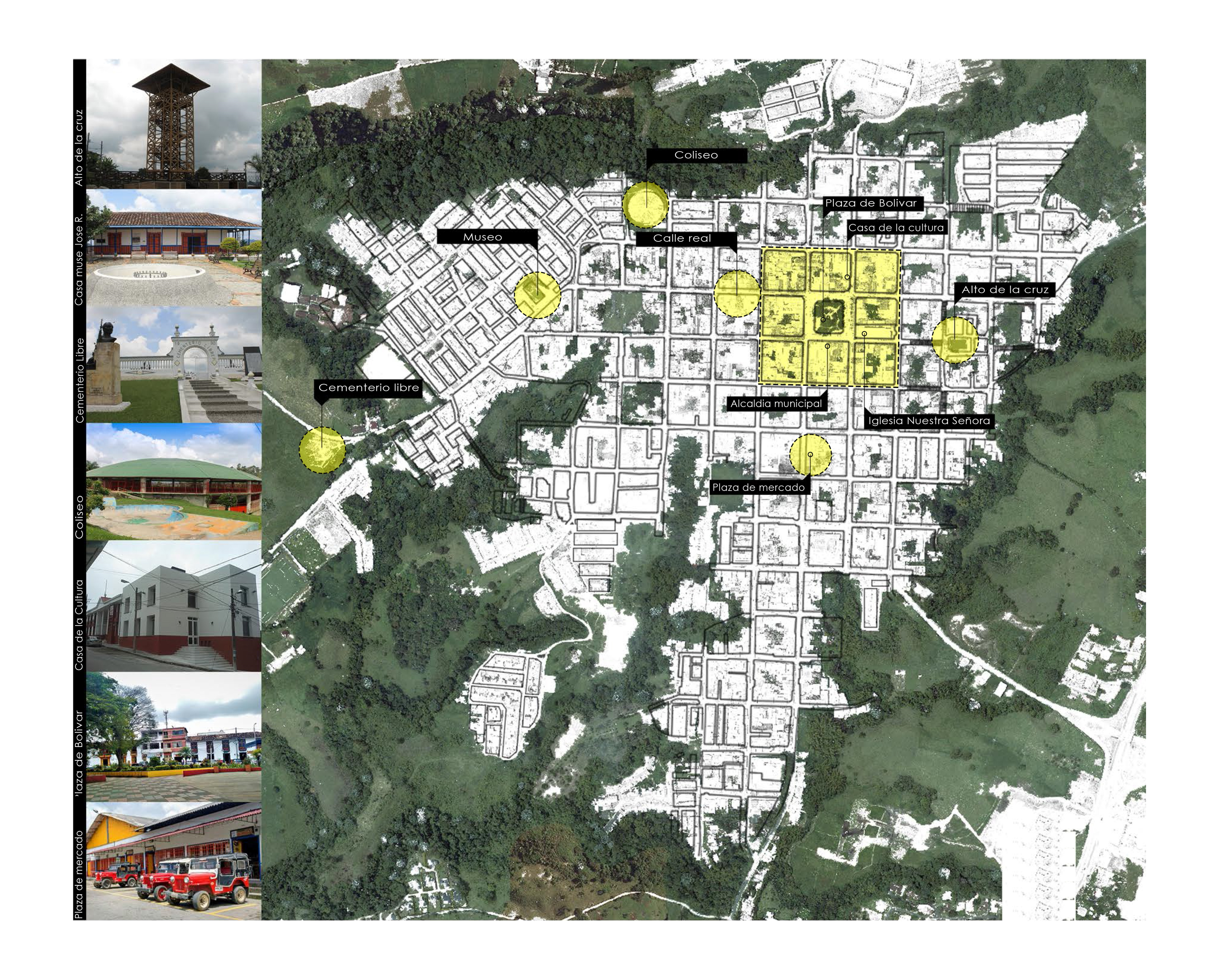 En este sentido, el espacio público simbólico comprende el parque principal como punto de espacio colectivo, donde se concentran actividades efímeras como ferias, eventos culturales, pero principalmente comercio diurno y nocturno. Asimismo, la calle real que, aunque no tiene un gran desarrollo comercial en comparación a otros municipios como Salento o Filandia, es de igual manera un eje ordenador. Y por otro lado, encontramos la Casa de la Cultura y la Iglesia como hitos históricos y culturales, además ciertamente de las viviendas tradicionales entorno a la plaza que albergan los usos comerciales (Figura 2).