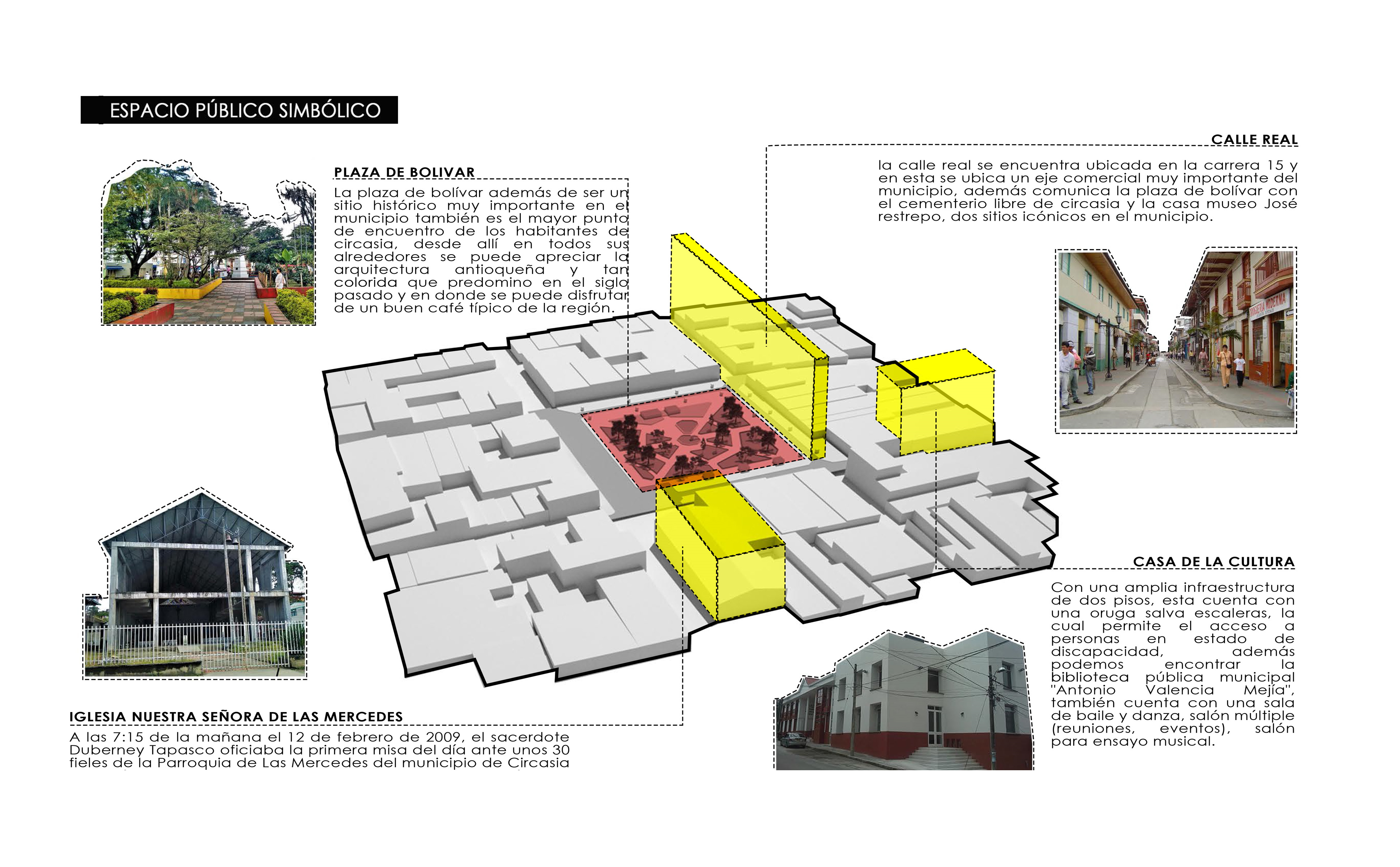 El espacio público simbólico comprende la descripción del patrimonio urbano, los hitos y puntos de referencia del municipio en relación a su historia (Figura 2). Circasia fue fundada en 1884 por un grupo de colonos antioqueños, y aún conserva las características originales de la trama urbana, su crecimiento ha sido de manera pausada y controlada, permitiendo así la conservación del patrimonio urbano y arquitectónico. Sin embargo, el 12 de enero del 2009, la iglesia Nuestra Señora de las Mercedes se ve afectada por un incendio el cual dejo en cenizas el patrimonio arquitectónico; fue construida entre los años 1912 y 1915 con un sistema de construcción en bahareque metálico, el cual tenía como objetivo ser sismorresistente y estaba protegido contra la humedad, en consideración a las variaciones climáticas y en especial a las condiciones sísmicos del departamento. A pesar de todo esto, un corto circuito fue lo que detono el incendio de la iglesia, y además de afectar la imagen urbana también afecto la identidad pues ha pasado más de una década donde la reconstrucción de la iglesia no se ve por terminada, ya que actualmente presenta una estructura con poco cerramiento que ha permitido realizar las actividades religiosas pero que no cumple con el simbolismo y la estética apropiada para una iglesia.