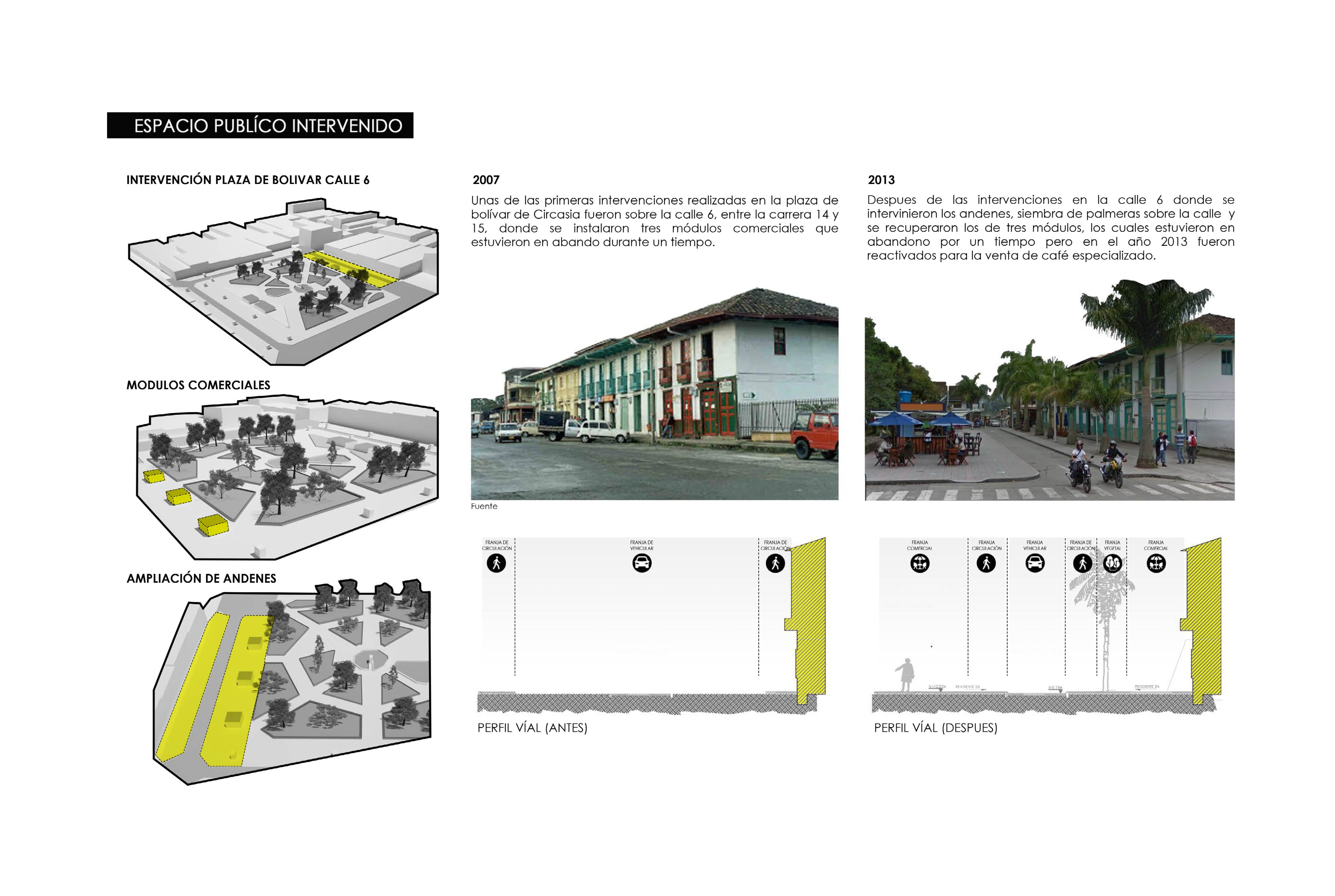 Para el 2013, sobre la misma zona, se da un proceso de arborización para mejorar la imagen de la calle y fortalecer el comercio existente, a lo cual se siembran palmeras. Posteriormente, para el año 2015 se realizó una intervención sobre la carrera 15 y la calle 7, la cual consistió en la ampliación de los andenes y se diseñó una plazoleta con 10 módulos comerciales y se reemplazaron los antiguos quioscos hechos en madera por módulos en acero inoxidable (Figura 3).