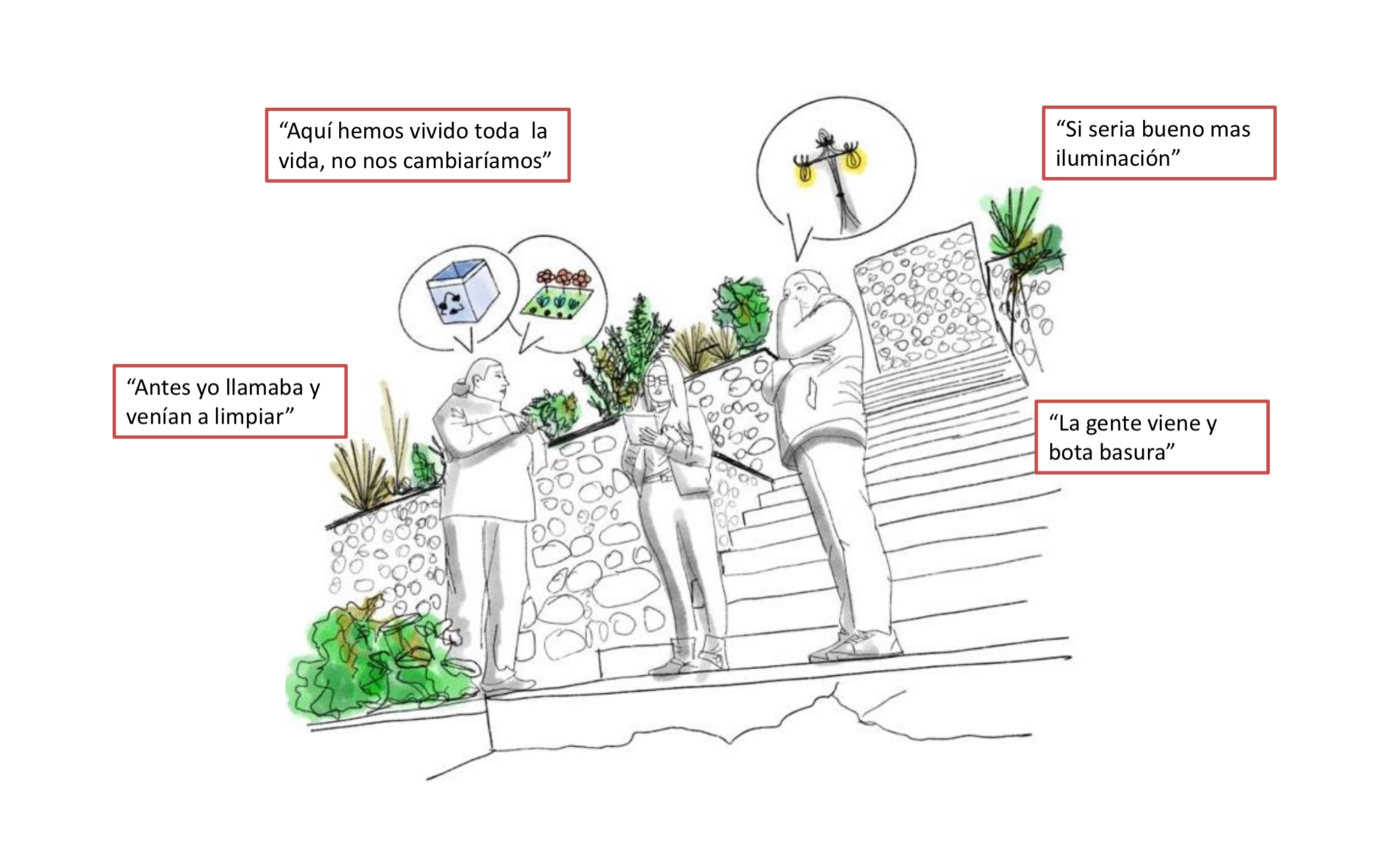 Esta planificación de los espacios públicos desde la visión de una estética civilizatoria, en la que los usos históricos comunitarios que se han dado a los espacios quedan relegados, provoca el desuso de los espacios públicos. Parecería una contradicción lo que se plantea, pues se asume que la rehabilitación urbana, presente en el discurso de la planificación de las ciudades desde finales del siglo XX, tiende que embellecer las plazas, las calles, los parques, a iluminarlos, a convertirlos en más seguros y habitables, sin embargo, las narraciones de los habitantes de la parroquia la Matriz presentan otra realidad. Lo que los habitantes plantean es que, la planificación de los espacios públicos no puede ser pensada sin tomar en cuenta las necesidades comunitarias (Figura 8), sin tomar en cuenta cuál es el deber ser del espacio para las personas que lo habitan, cuáles son las necesidades de los diversos grupos etarios, cuáles son significados culturales y sociales presentes en los espacios que no pueden ser borrados.