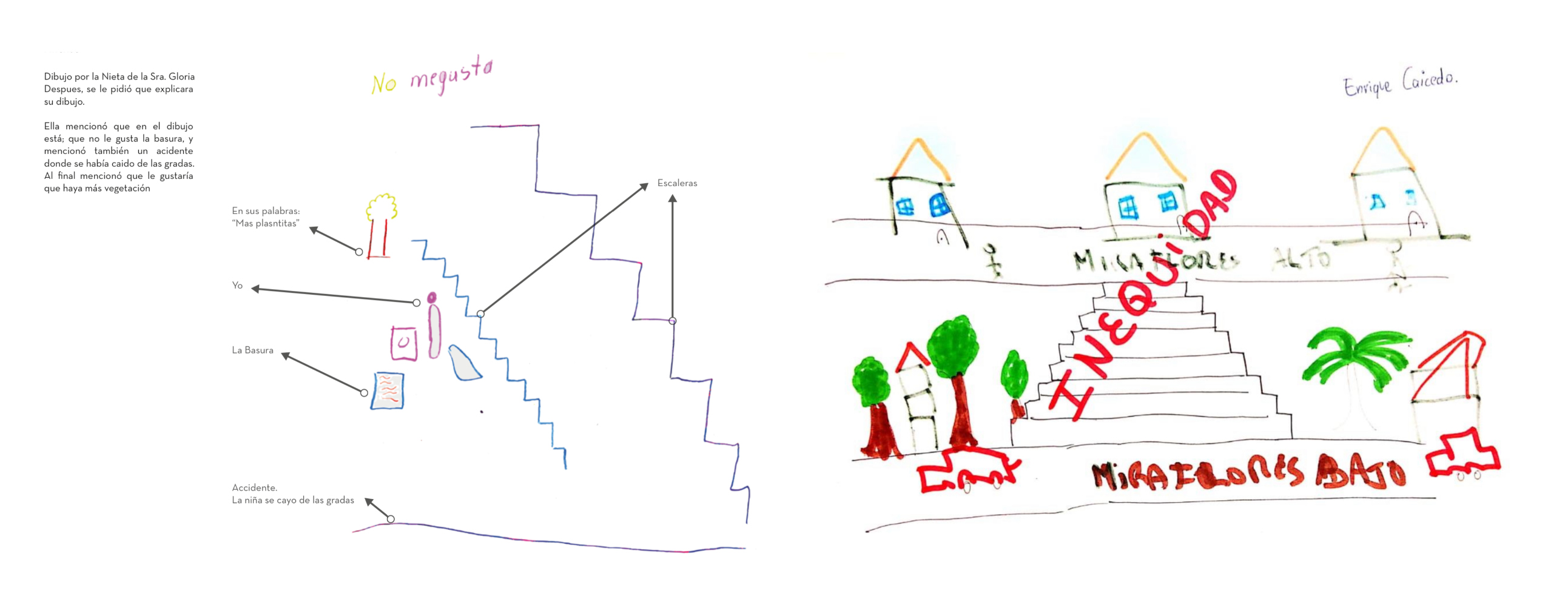 Tomando en cuenta que los niños y niñas también son parte de la voz de la comunidad, se los entrevisto a partir de la construcción de imágenes, que permitieron dialogar a través de lo visual, es decir, representar de manera gráfica su percepción sobre el espacio. La aplicación de esta técnica consistió en que los niños y niñas dibujen sobre la relación que tienen con los espacios, la forma en la que usan y entienden el espacio, y, además, cuáles son sus expectativas en torno al deber ser del espacio público desde el entendimiento de sus derechos a la recreación y el ocio (Figura 5).
